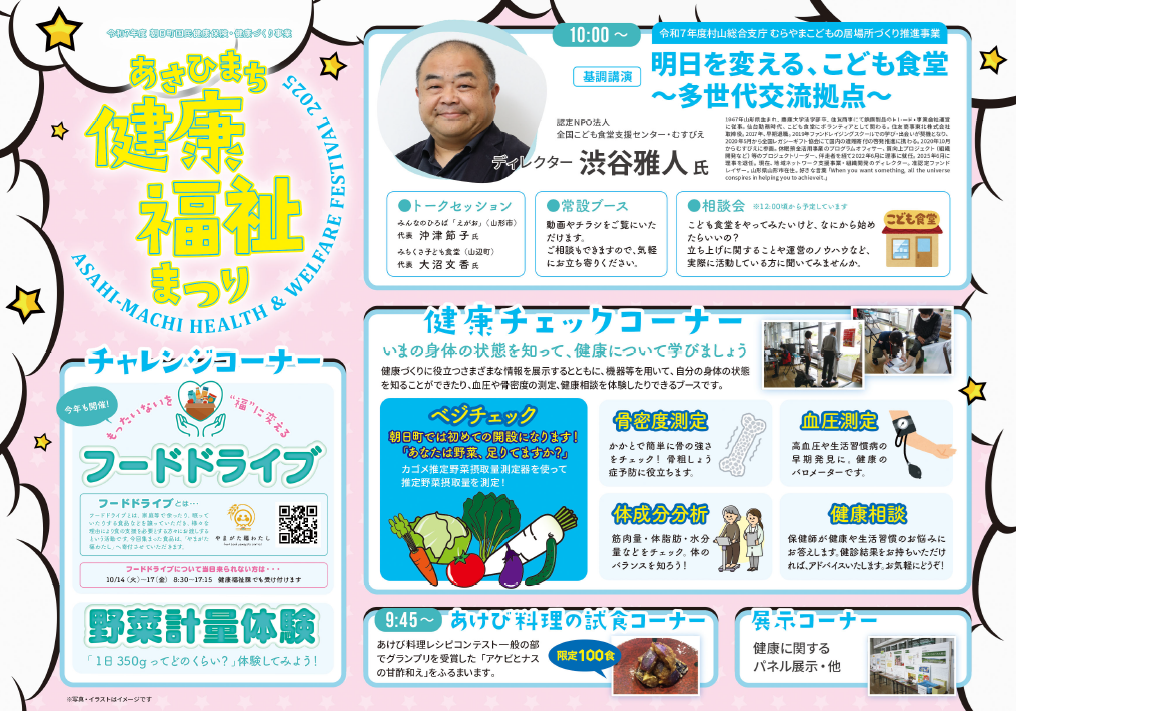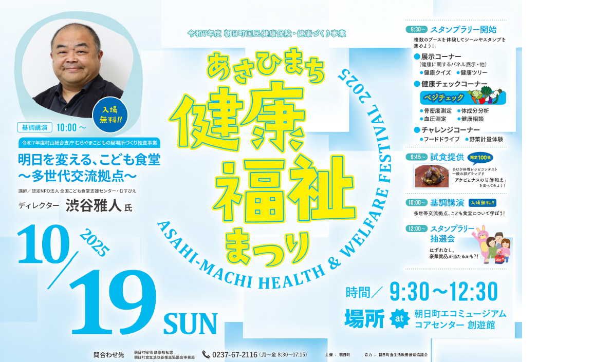 多世代交流拠点である「こども食堂」に関する基調講演や、健康に関するパネル展示、健康チェック、フードドライブを開催します。おすすめは、朝日町では初めての開設となる「ベジチェック」!推定野菜摂取量を測定できます。あなたは野菜、足りてますか?また、あけび料理レシピコンテスト一般の部グランプリに輝いた「アケビとナスの甘酢和え」の試食を100食限定でご用意し、皆様のお越しをお待ちしております。
