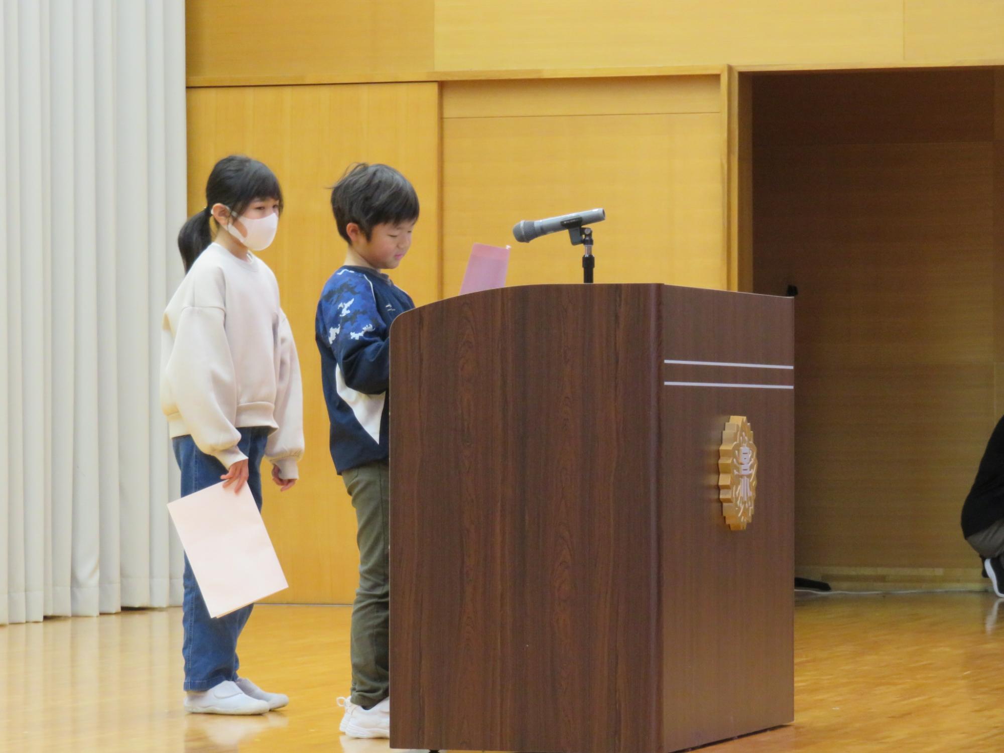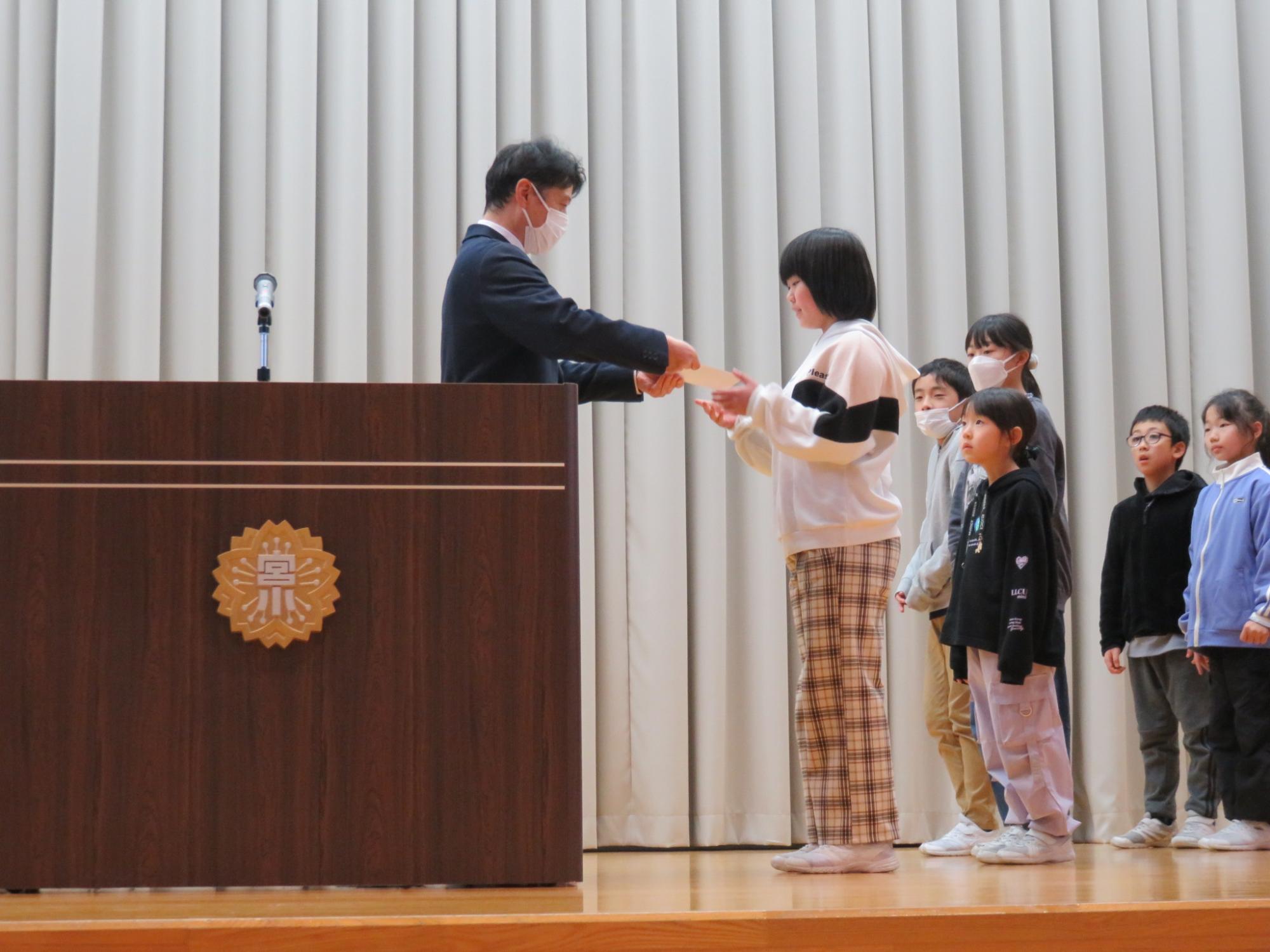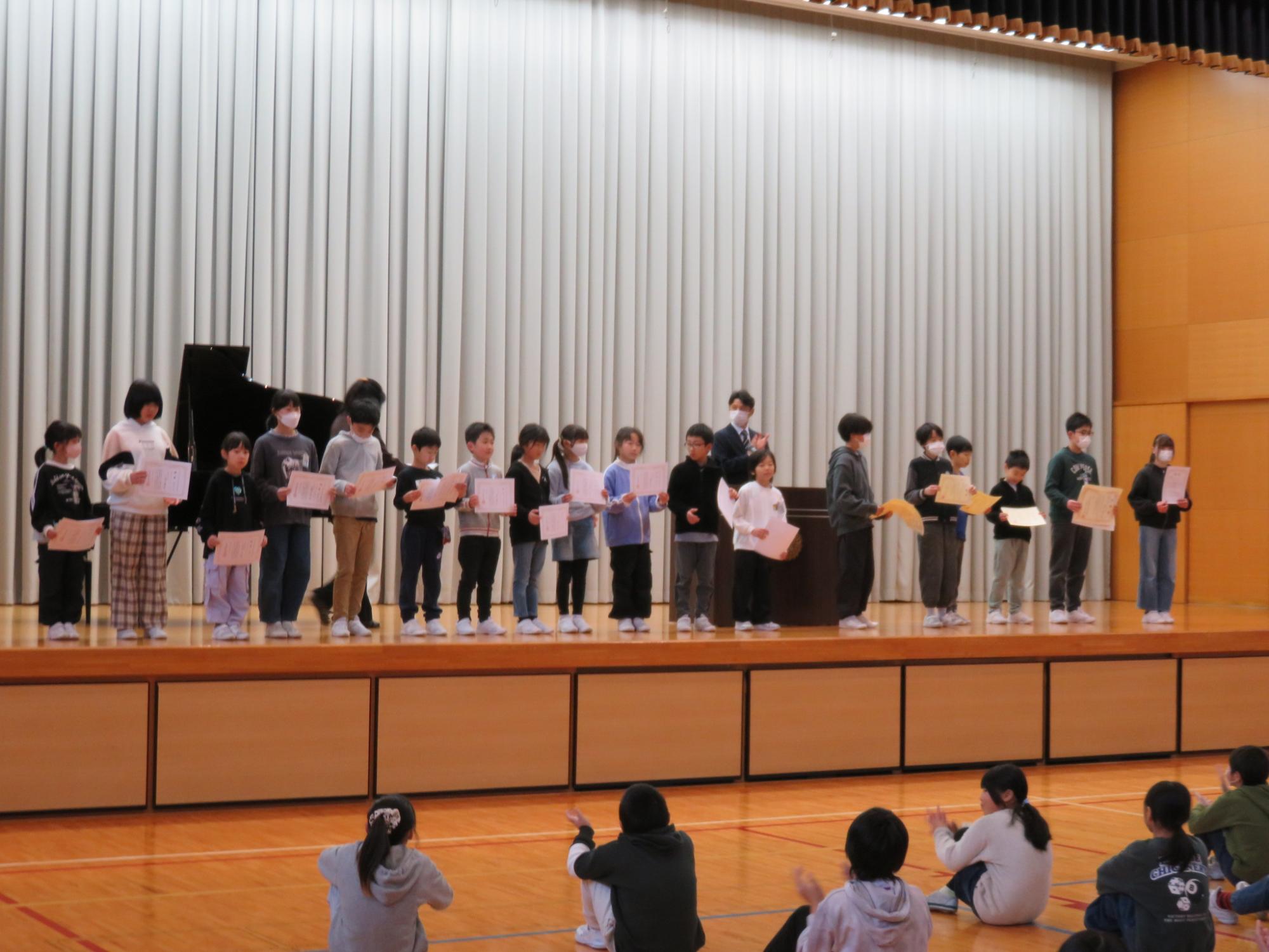 終業式の前には、ひめさゆり俳句や大沼の浮島俳句、選挙ポスター、人権書道の表彰を行いました。入選したみなさん、おめでとうございます。