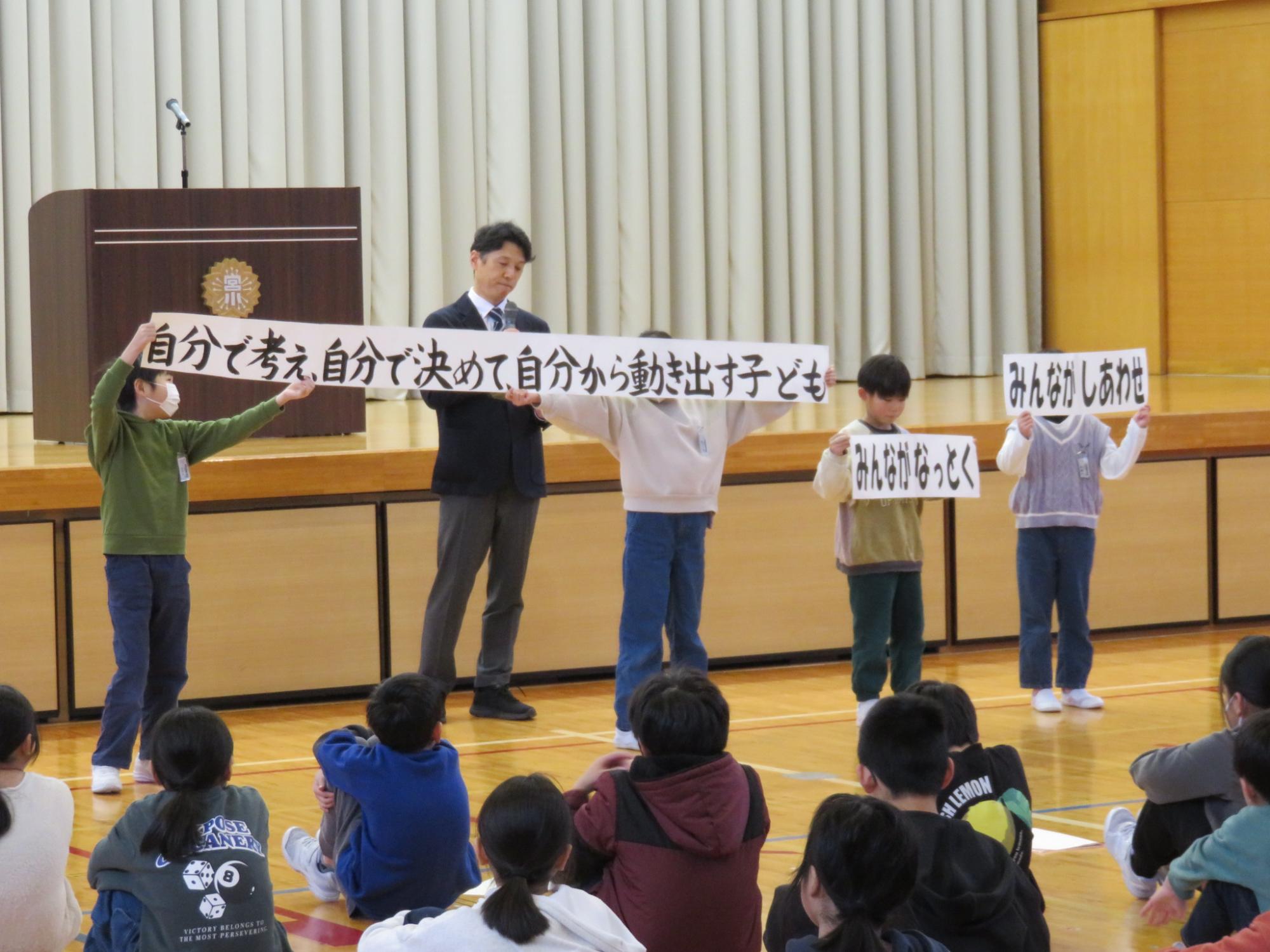 今年度の学芸会のスローガンは「届けよう みんなで創る 輝く ステージ」でした。5年生の「宮小豊年太鼓」で幕を開け、4年生の合唱「すてきな友達」とダンス「Mela!」、1年生の劇「もじモジクエスト」、3年生の劇「アイウエ オリババ」、2年生の音楽・劇「お手紙」、そしてトリを飾った6年生の劇「グナツニ・イラミー」。どの学年もそれぞれの個性、持ち味を十分に発揮して、ステージの上で輝く姿を見せてくれました。見ている人たちにも、「みんなで創った輝くステージ」をお届けすることができたのではないかと思います。