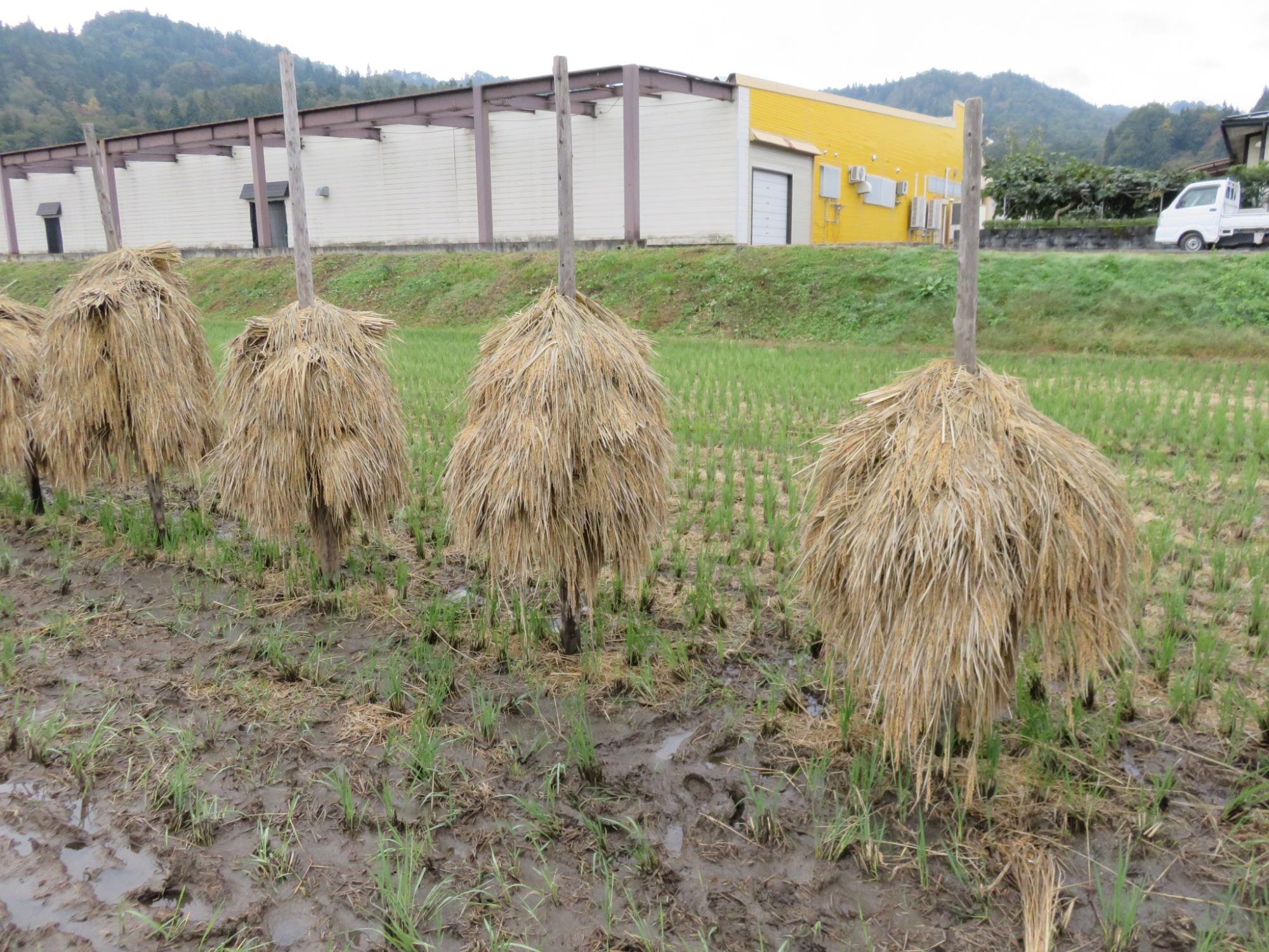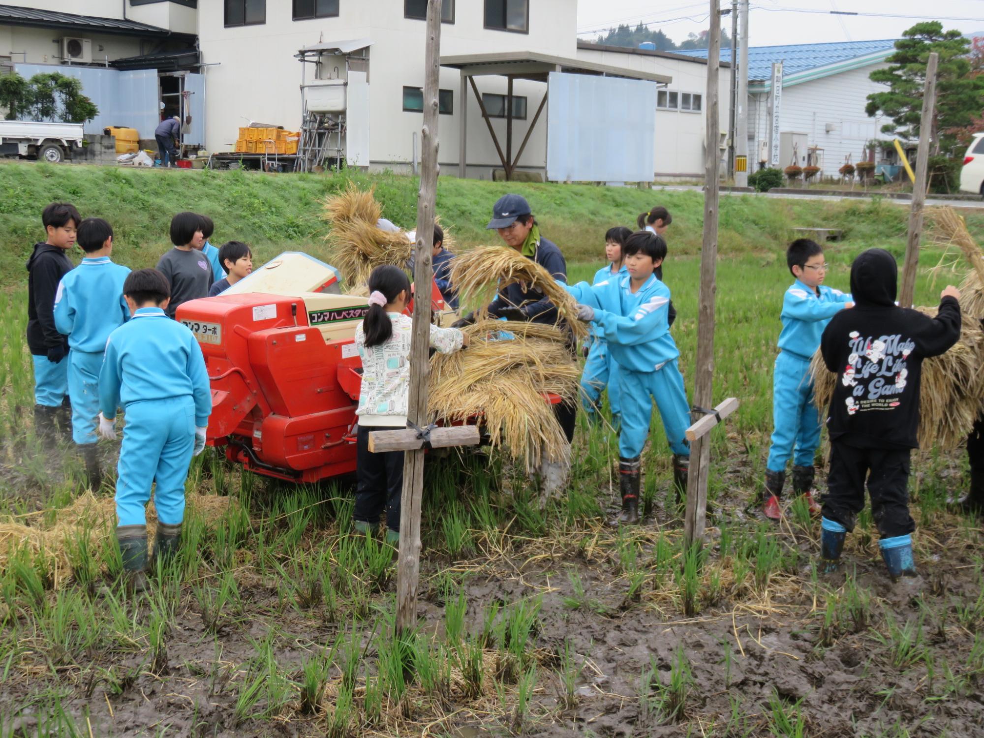 9月19日に稲刈りをした5年生。この日は、脱穀作業を体験しました。杭掛けした稲をどんどん脱穀していきます。週初めの雨で、田んぼはドロドロ、かなりぬかるんでいましたが、子どもたちは泥だらけになりながらも、笑顔で作業を進めていました。春の田植えからご指導、ご協力をいただいた地域講師の方々に心より感謝申し上げます。