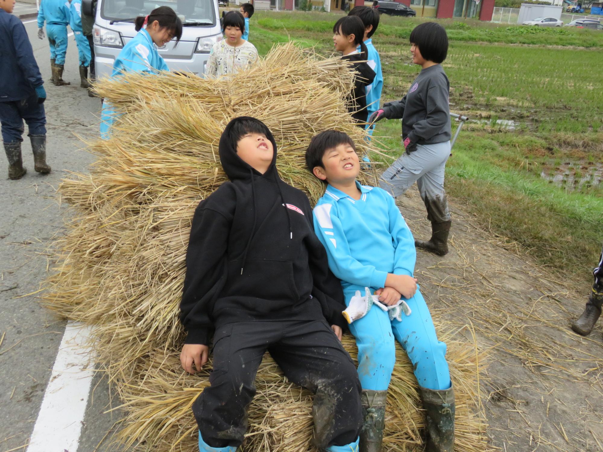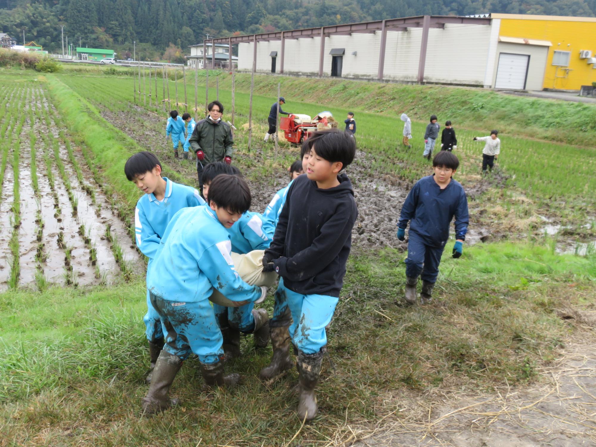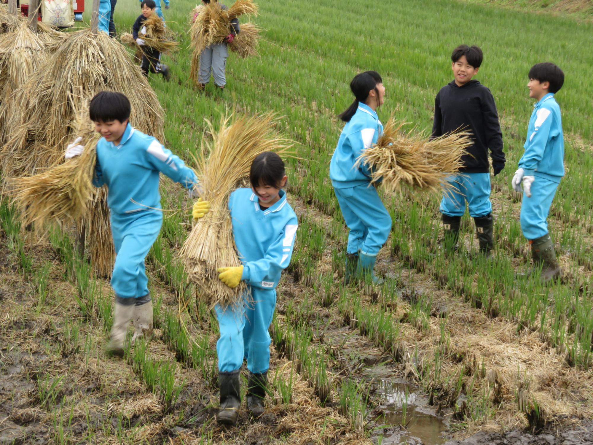 雨のため、1日延期となった5年生の稲刈り体験。地域講師の方のご指導のもと、たくさんの保護者の皆様にもご協力いただきながら作業を行いました。前日の雨で、田んぼはかなりぬかるんでいて、子どもたちは悪戦苦闘。稲を刈る以前に、動くことも難しそう……。それでも、仲間と声を掛け合い、頑張りました。
