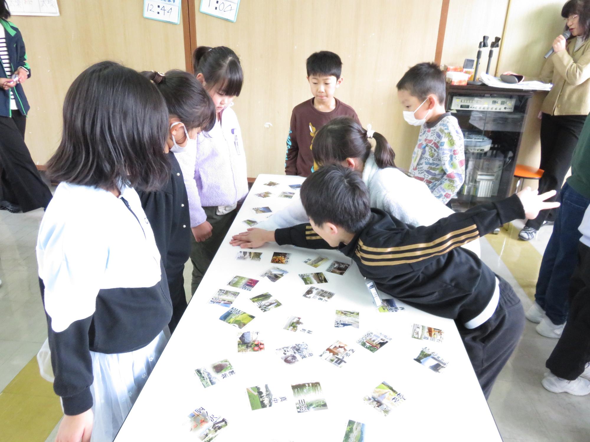 朝日町3つの小学校の1~4年生がそれぞれ集まって行う合同学習がスタートしました。この日は4年生が西五百川小学校に集まりました。自己紹介ゲームの後、これまでそれぞれの学校で総合的な学習の時間に学習してきたことを発表し合いました。そして、最後は朝日町エコミュージアムかるたの大型版を使って、かるた大会。学校関係なく、応援したり励ましたりする声が響き合っていて、楽しく交流することができました。