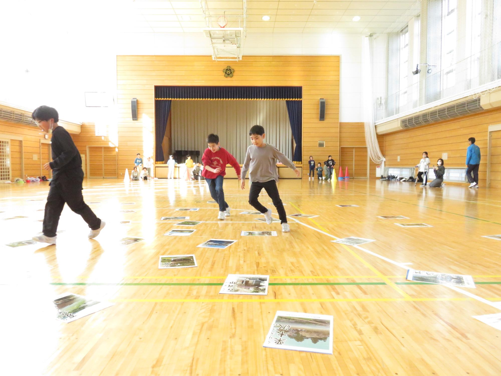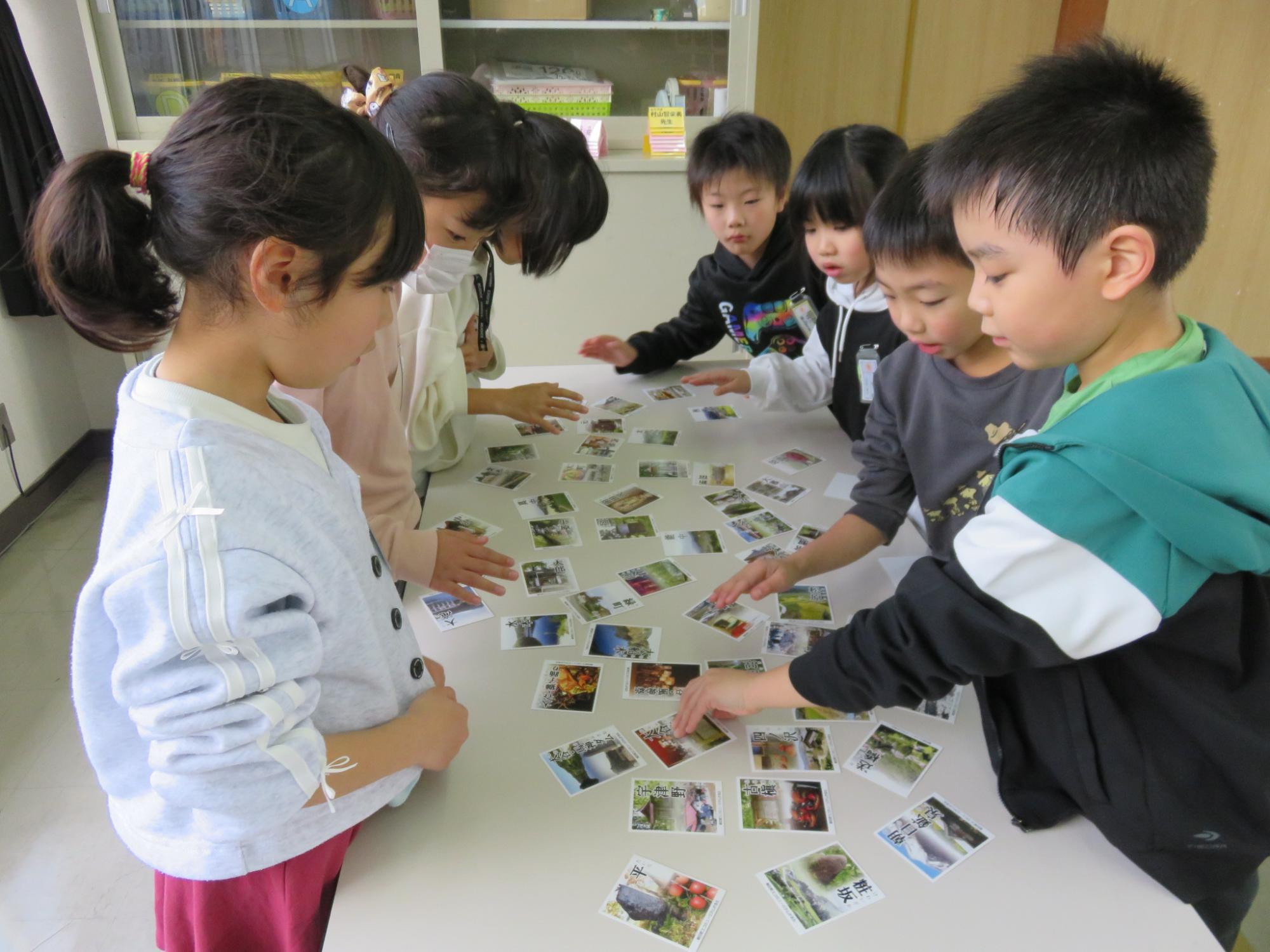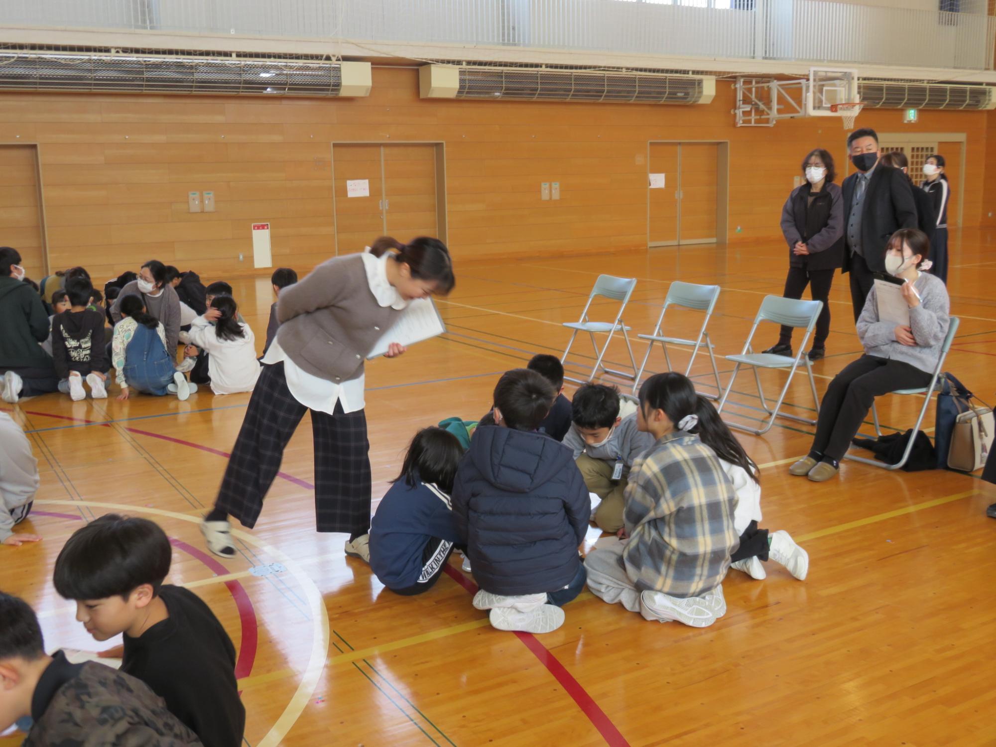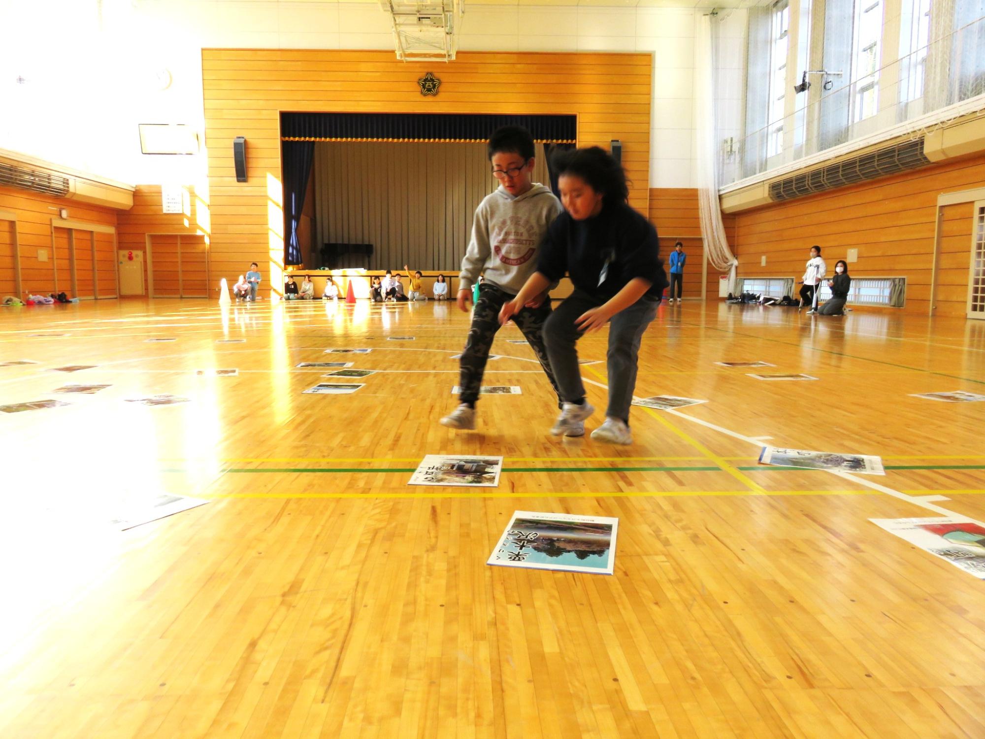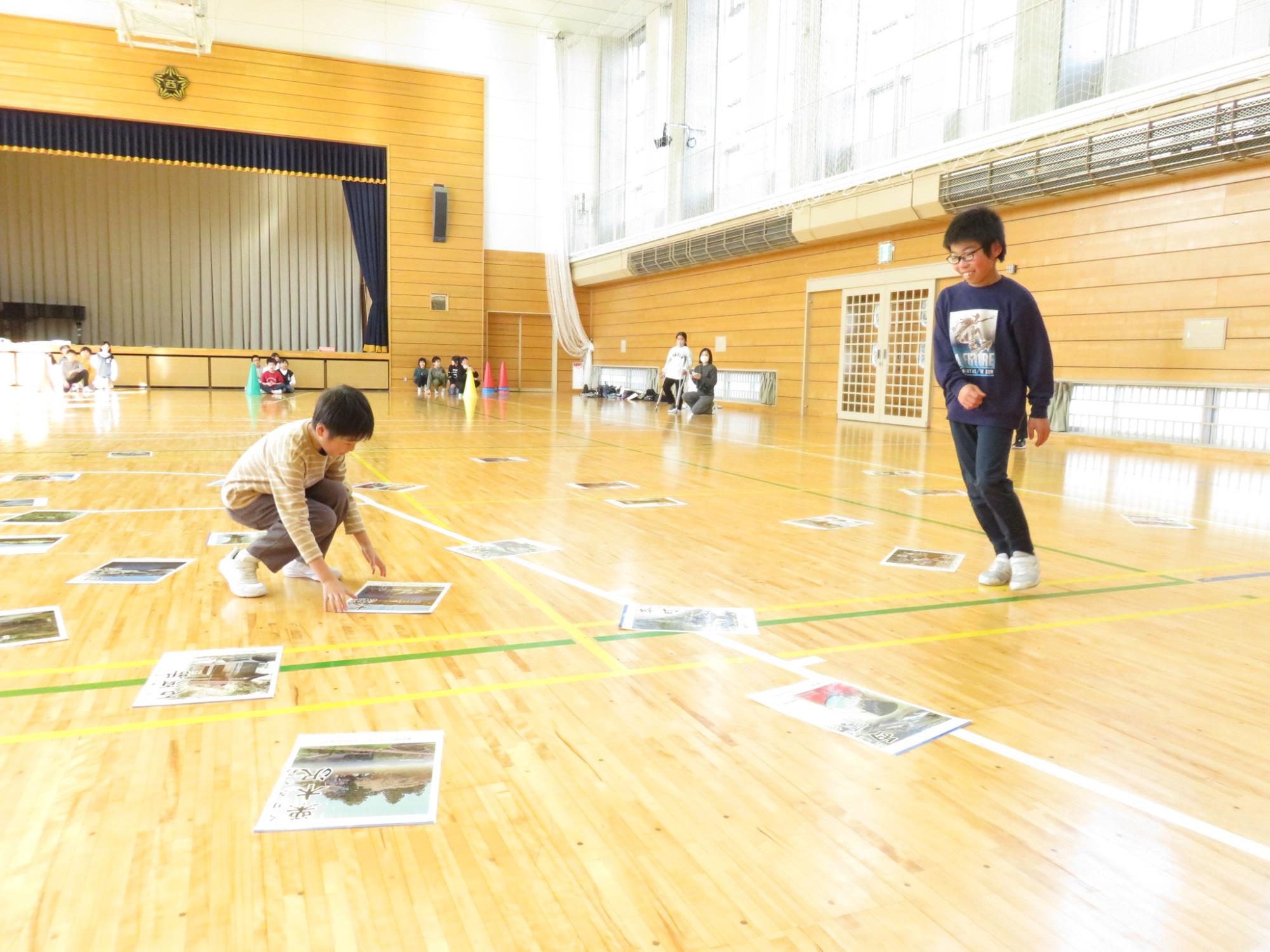 町の小学校1,2年生が宮宿小学校に集まって、合同学習を行いました。1年生は体育館や教室でいろいろなゲームをして交流しました。数か月前までは保育園で一緒だった友達と再会し、始まる前からわくわくが止まらない様子の1年生でした。元気いっぱい、笑顔いっぱいの楽しい時間を過ごすことができたようです。2年生は、食堂で生活科で学習したことをそれぞれ発表しました。同じ朝日町と言っても学区が違うと知らないこともたくさん。興味をもって聞いていました。その後、中間休みを一緒に過ごして、最後は朝日町エコミュージアムかるたを楽しみました。