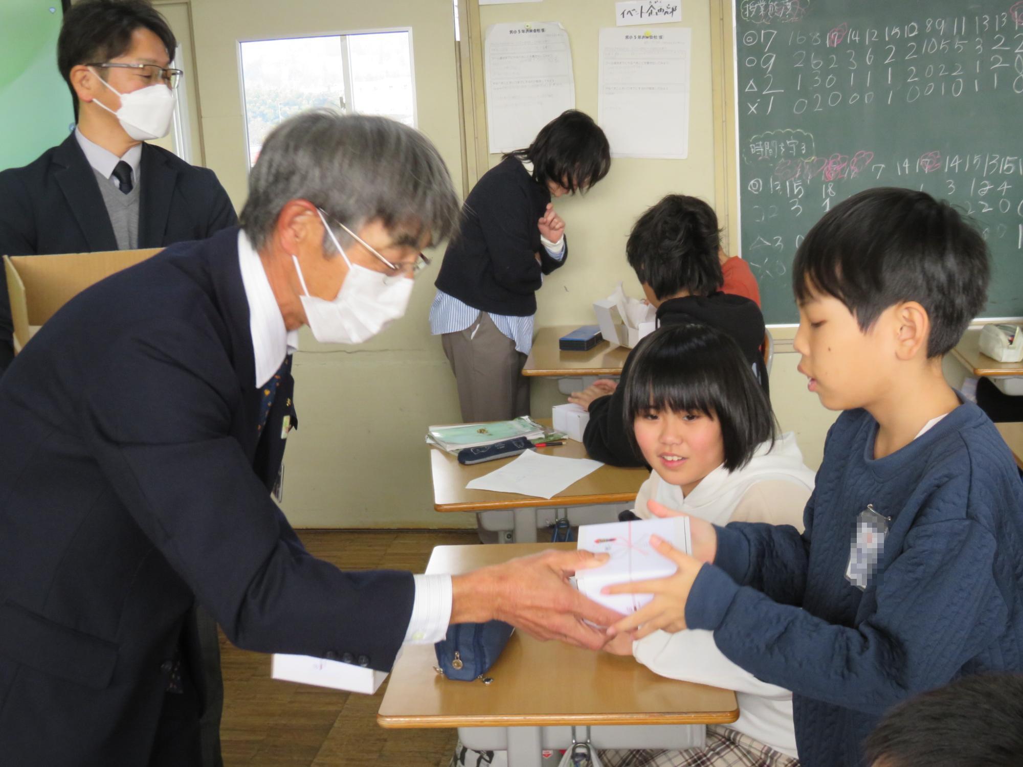 JAさがえ西村山の方にご来校いただき、5年生にごはん茶碗、1年生にランチョンマットを贈呈していただきました。ごはん茶碗の方は、要望に応える形で、やや小さくなったとのことでした。お兄さんお姉さんがいる人は、お家で比べてみてくださいね。