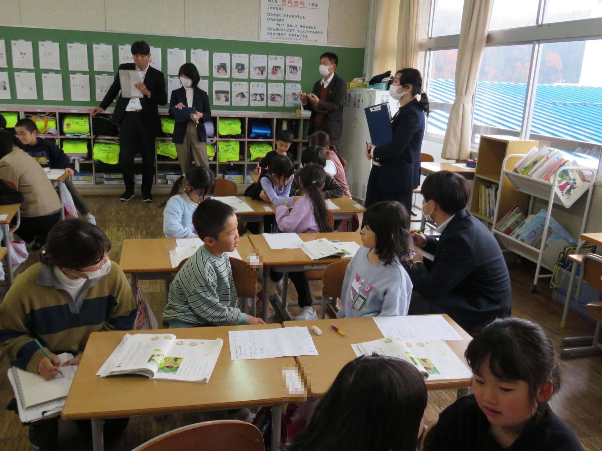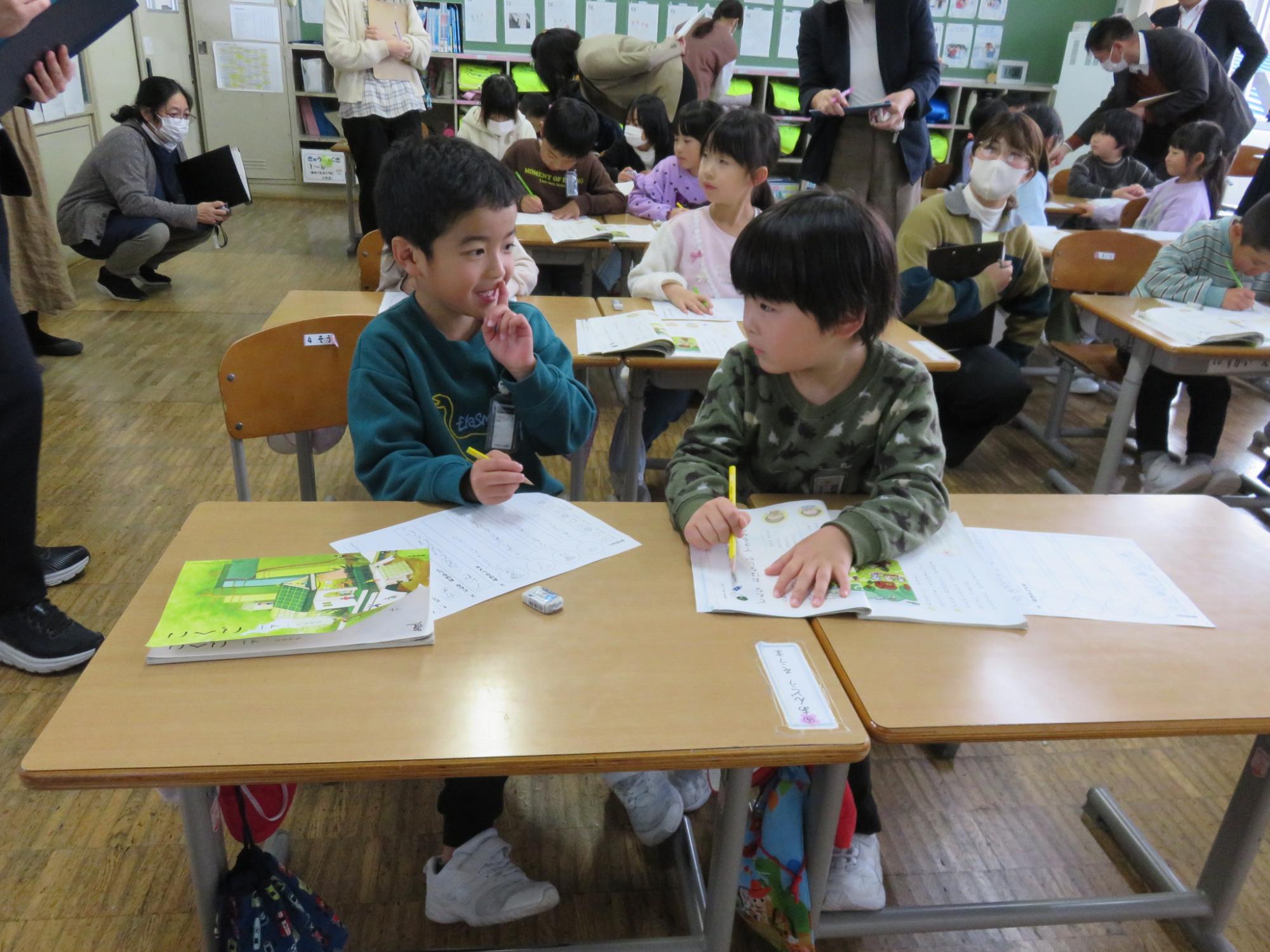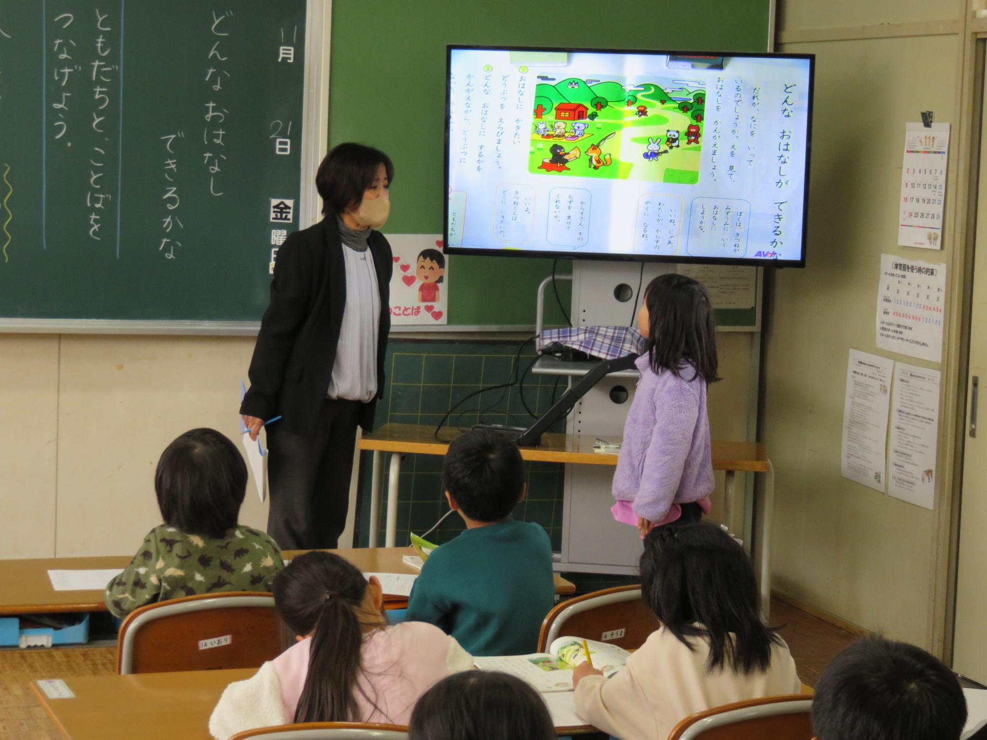 1年生の授業研究会を行いました。国語「どんなおはなしができるかな」の学習でした。教科書の絵の中からお話に書きたい登場人物を選んで、お話を作っていくという学習。この日は、ペアになった友達と役割を決めて、動物になったつもりでお話をするという内容でした。相手の言葉に合わせて、どんなことを話すとつながるのかを考えながら話をして、楽しそうに学ぶ子どもたちでした。