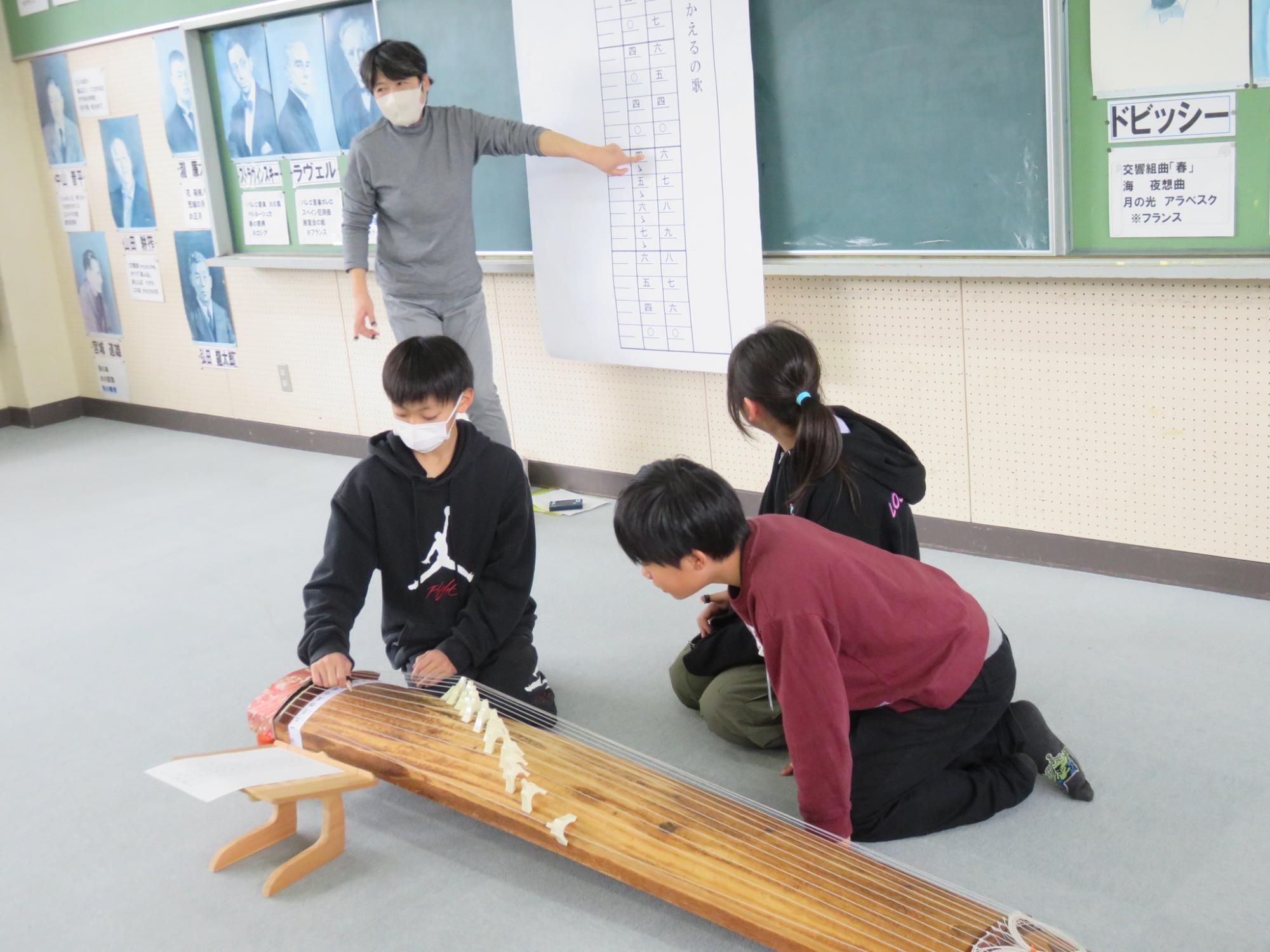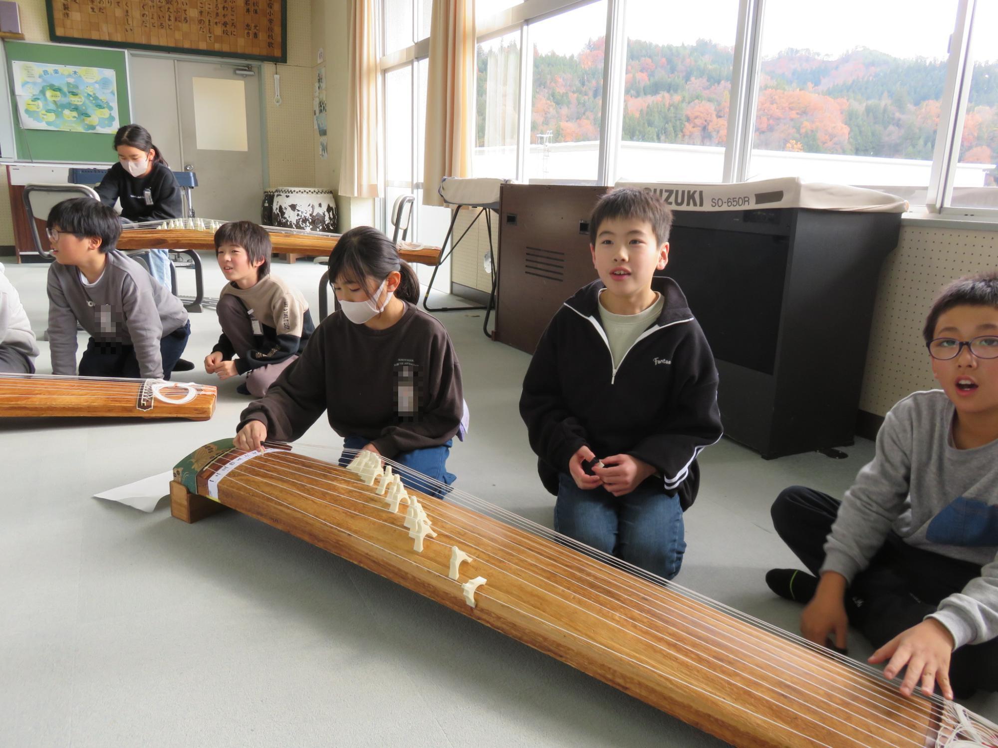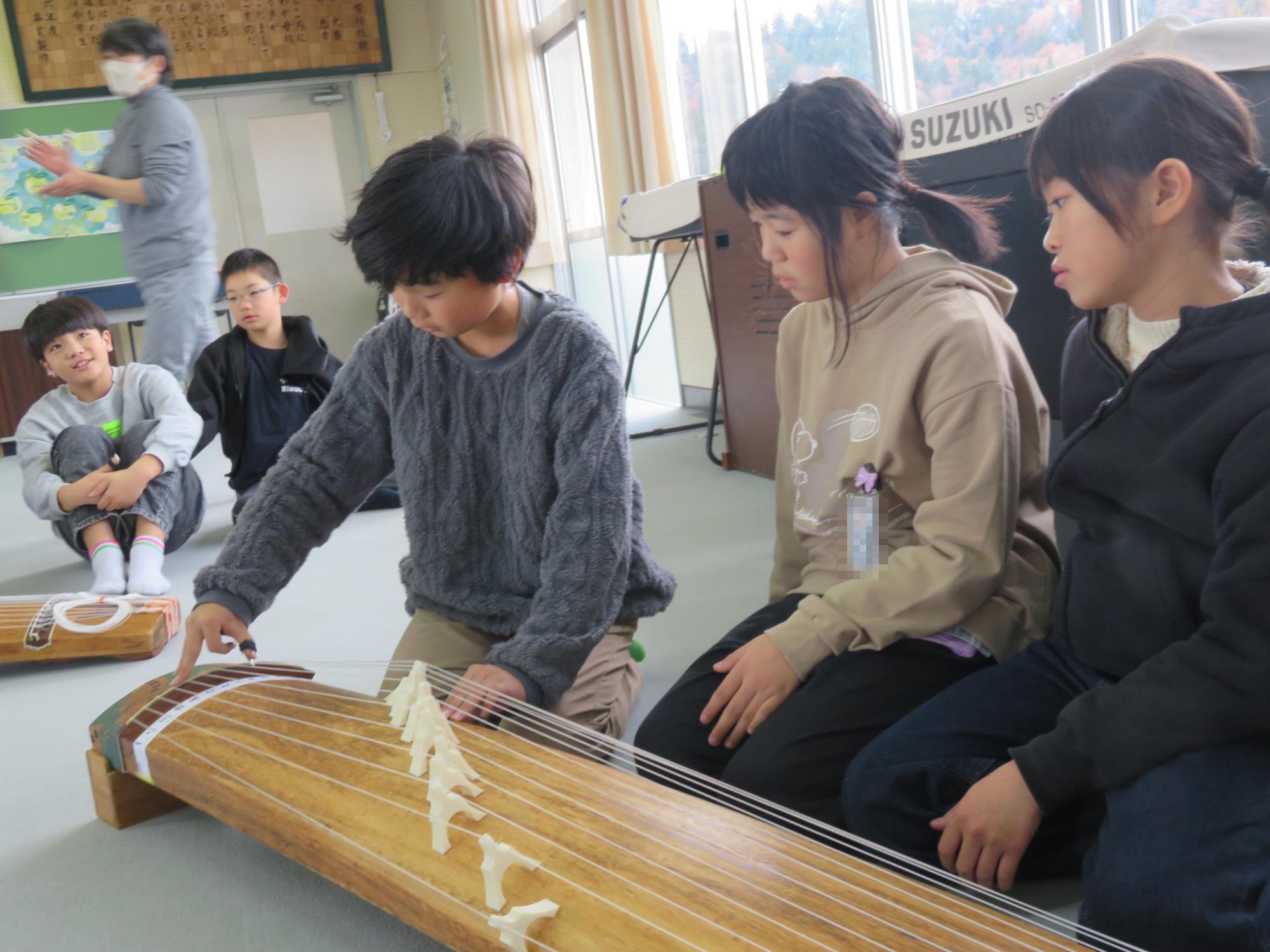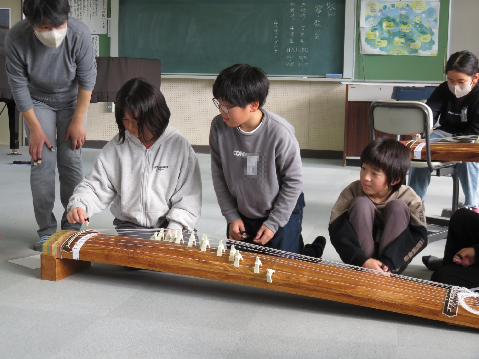 4年生と5年生を対象に、日本の伝統楽器である「筝」に親しむ筝教室を行いました。生田流の講師の先生から演奏を聴かせていただいたり、実際に「かえるの歌」の演奏に挑戦したりしました。