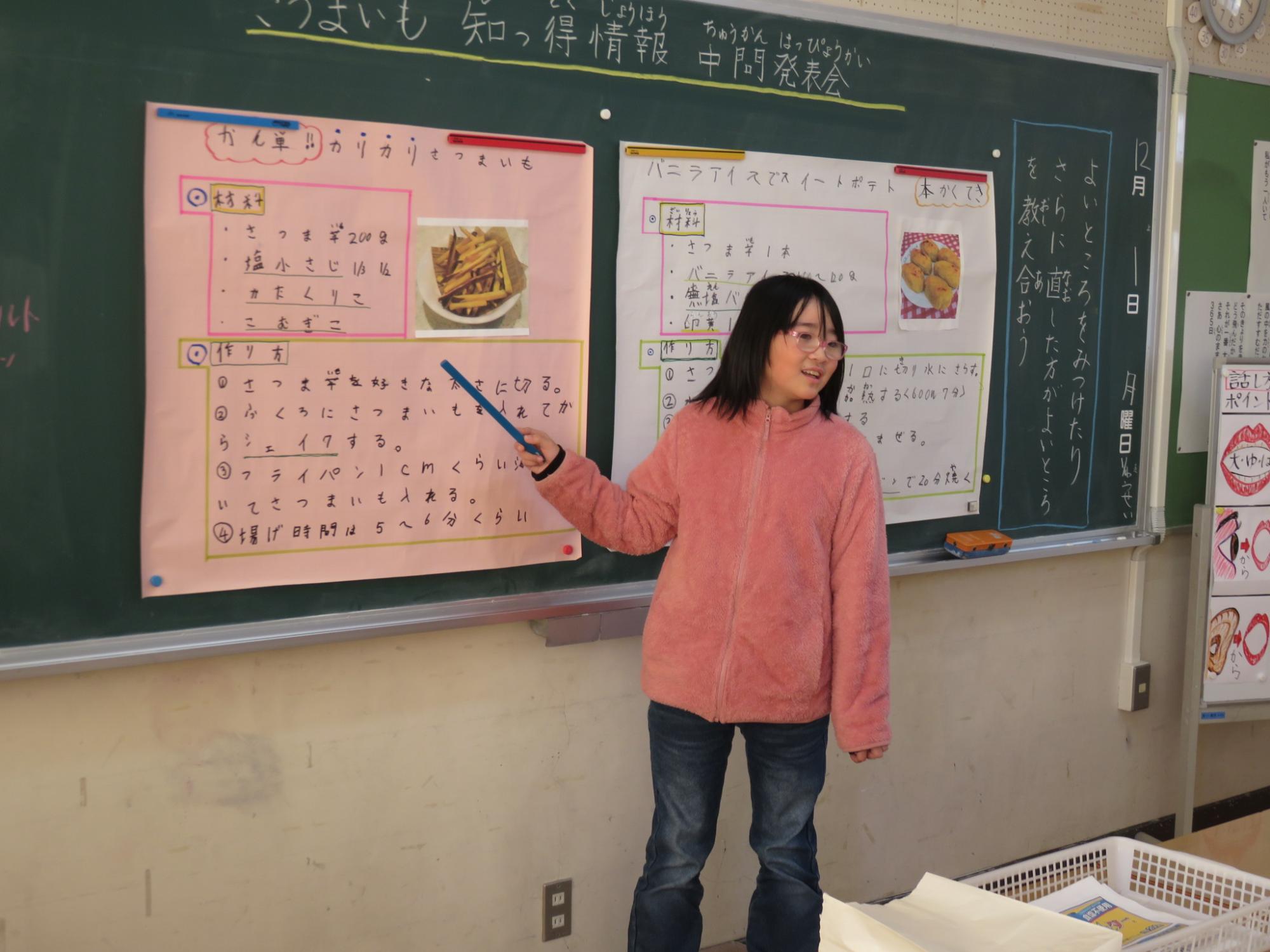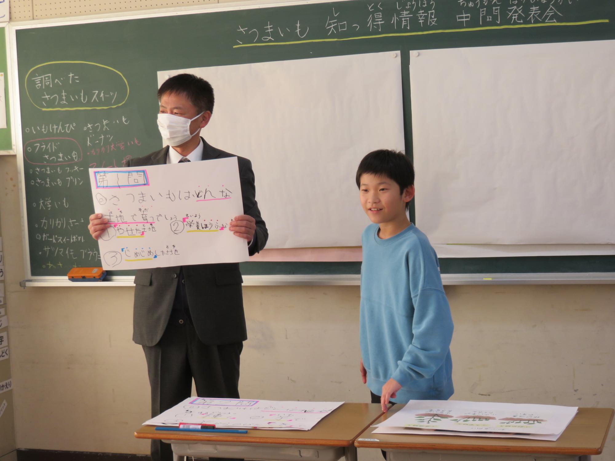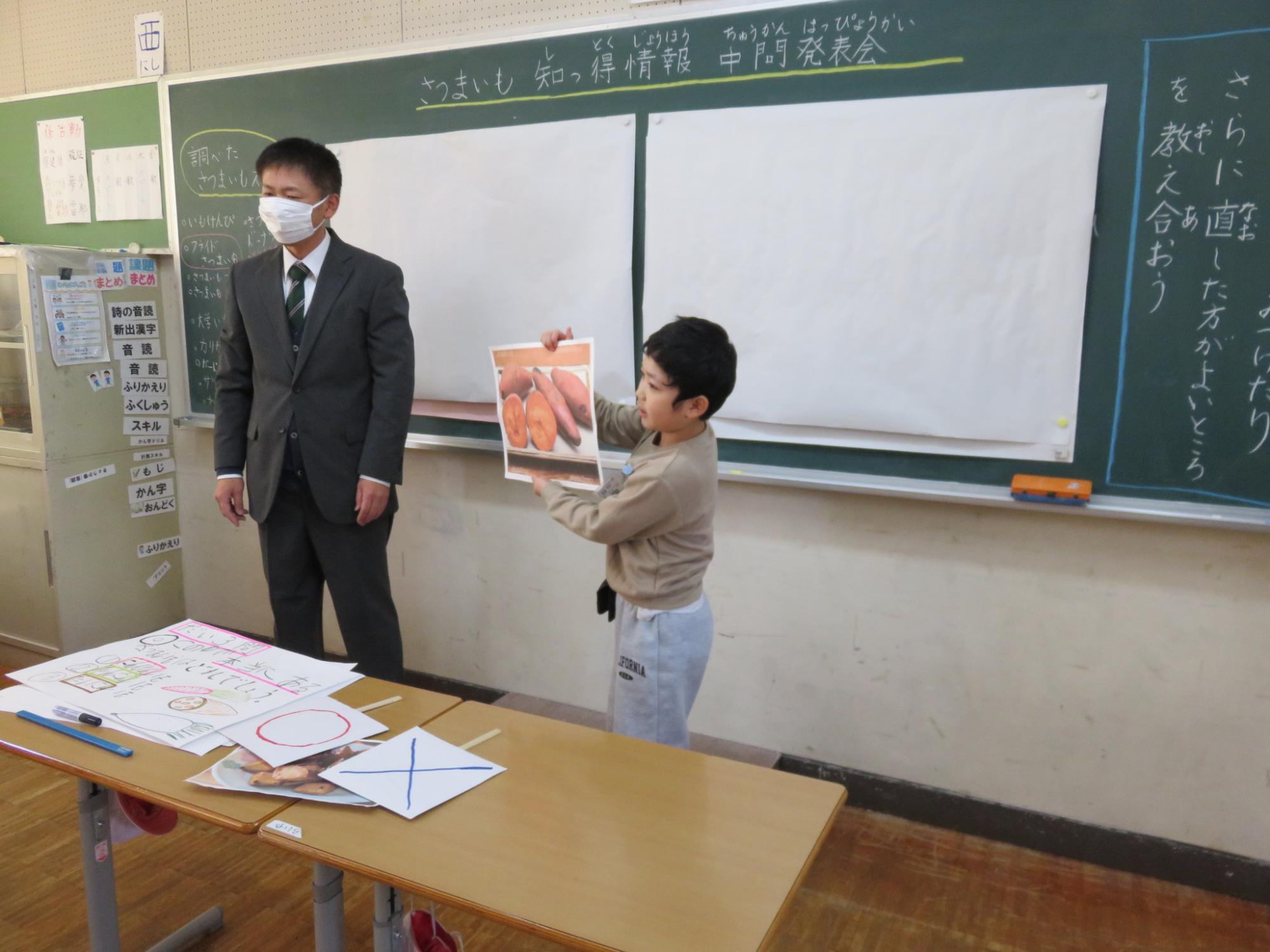 たんぽぽ学級の授業研を行いました。サツマイモ知っとく情報について調べて、まとめたものの発表練習の時間でした。クイズを交えたり、写真を見せたりしながら、「へえ~そんなんだ」と感じる知っとく情報について、上手に発表することができました。本番では、交流学級のみんなに向けて発表するとのこと。自信をもってがんばれ!