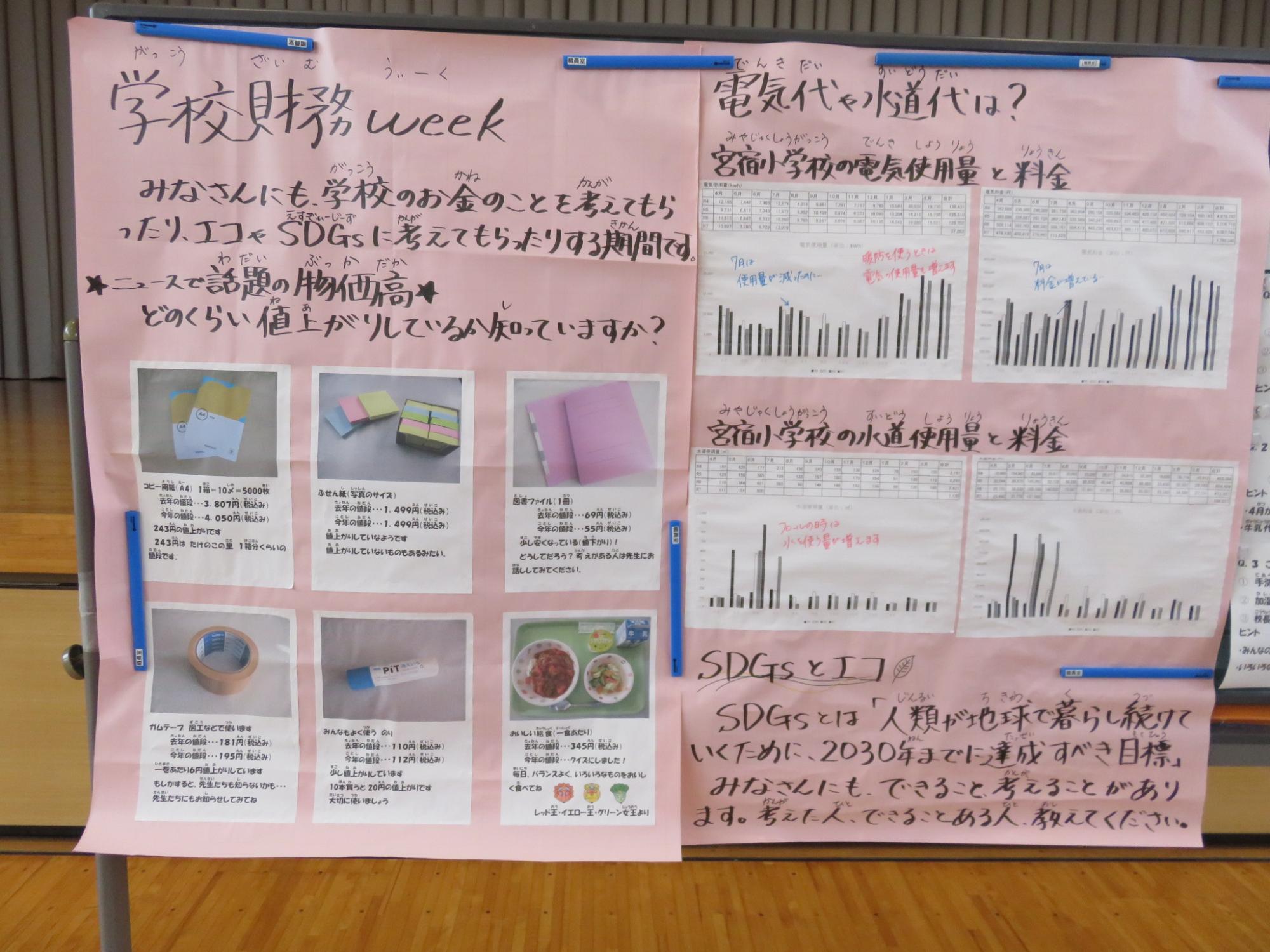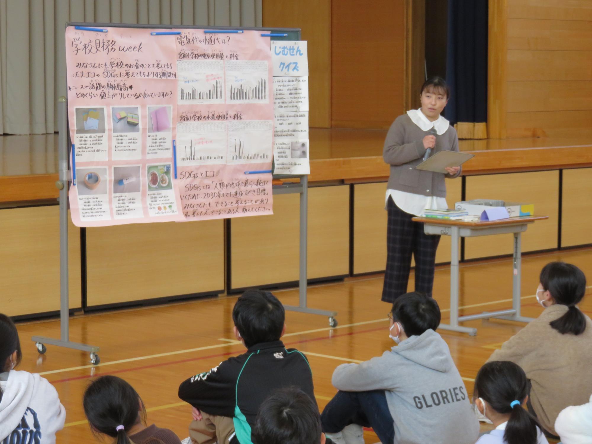 全校朝会で、佐藤主事が学校の「お金」に関するお話をしてくれました。学校財務ウィークとして昨年度も実施しています。普段、子どもたちは学校で使われているお金について考えることはあまり多くないと思いますが、この日の講話だけでなく、掲示も活用しながら意識を高めてくれています。