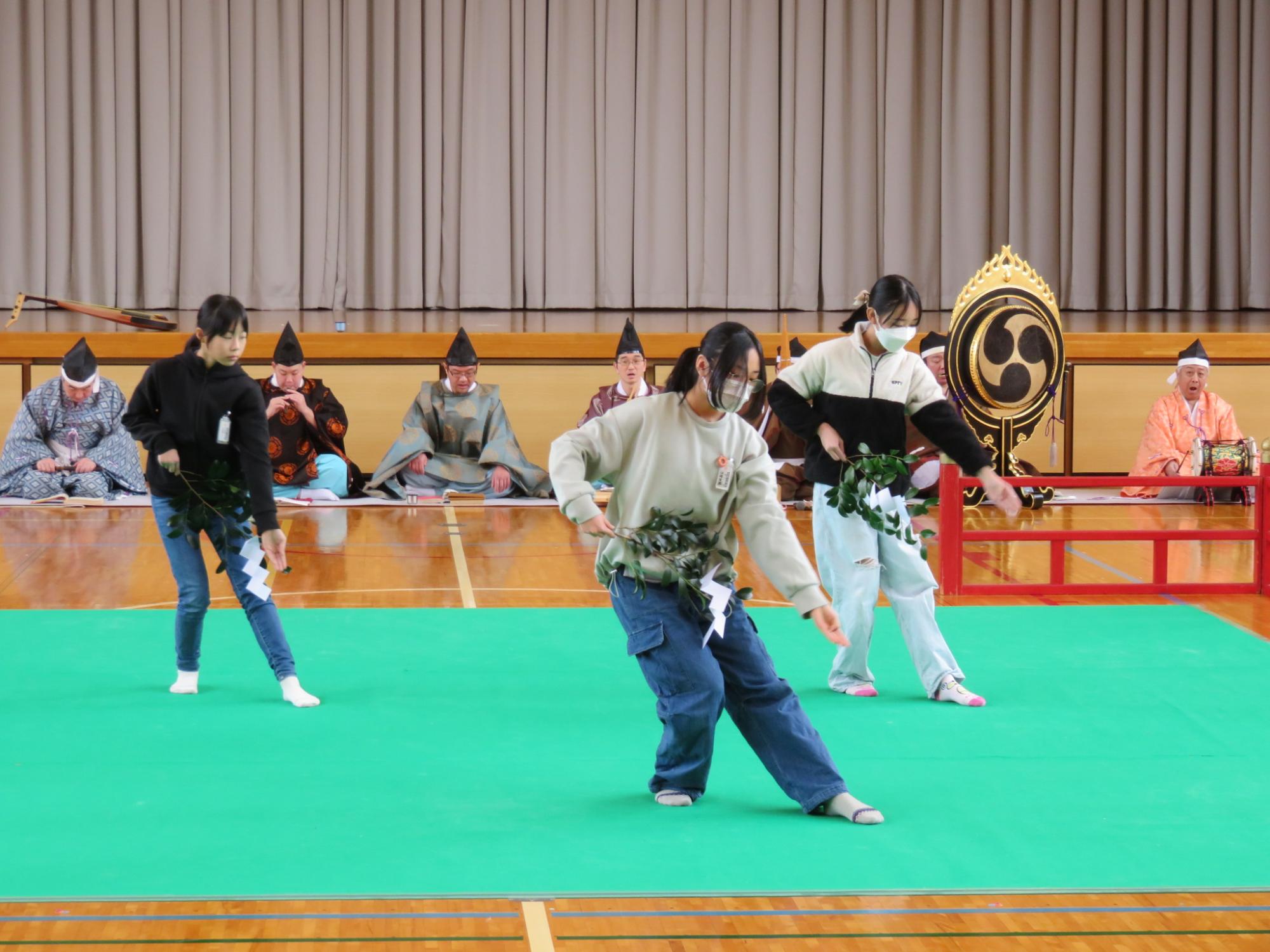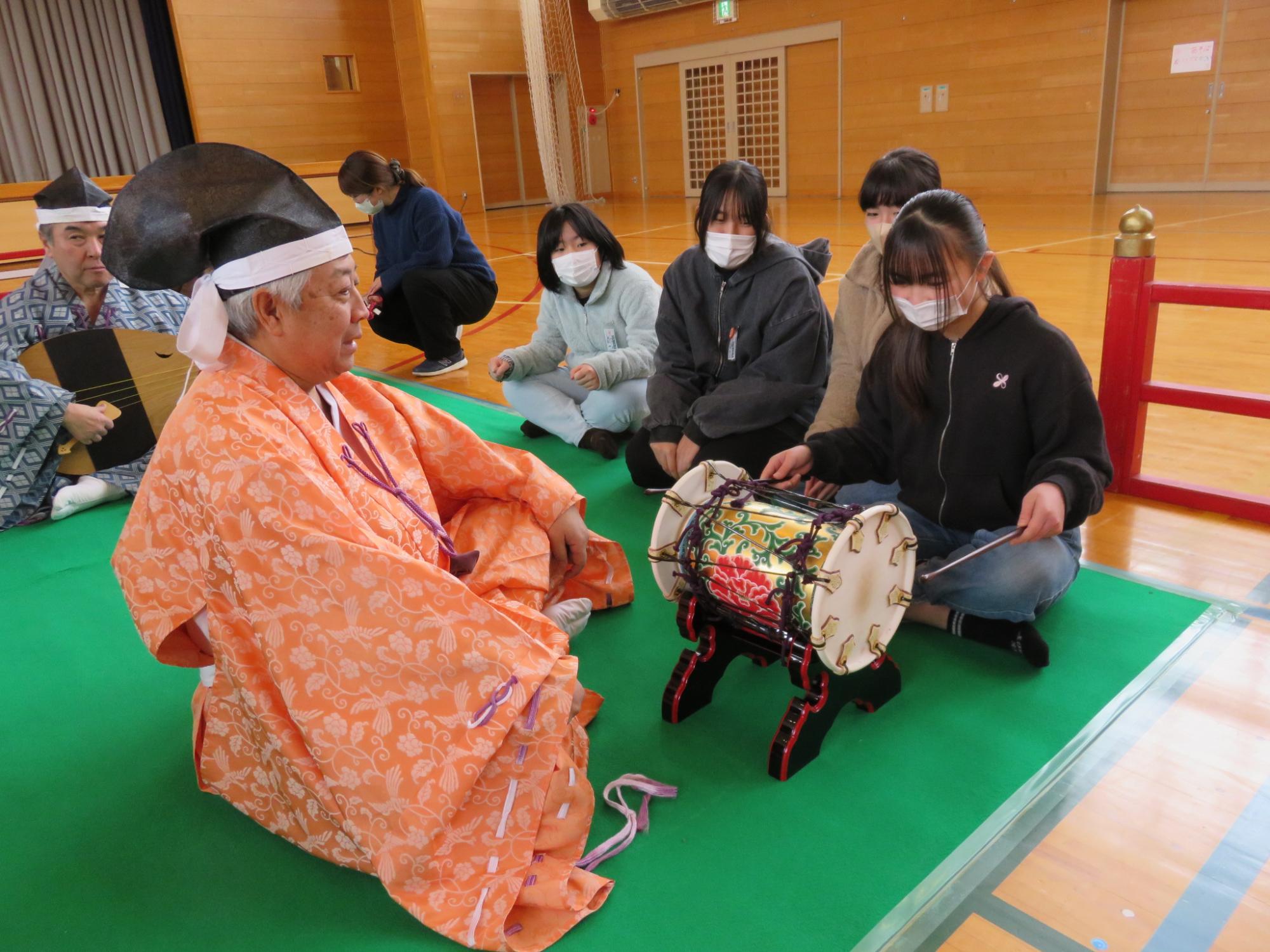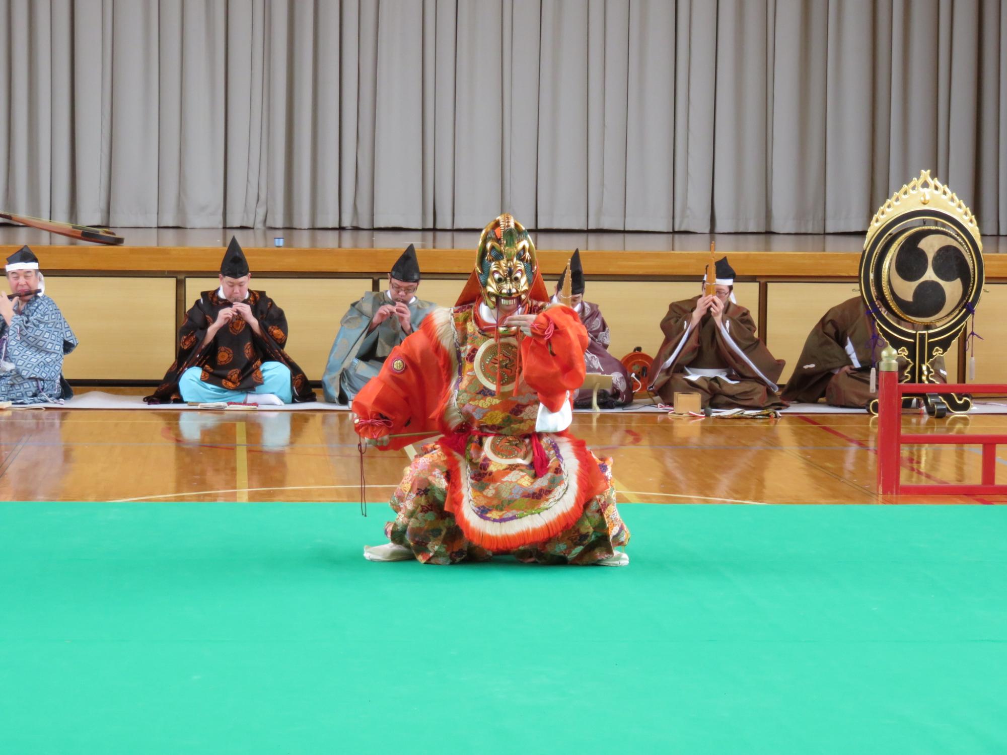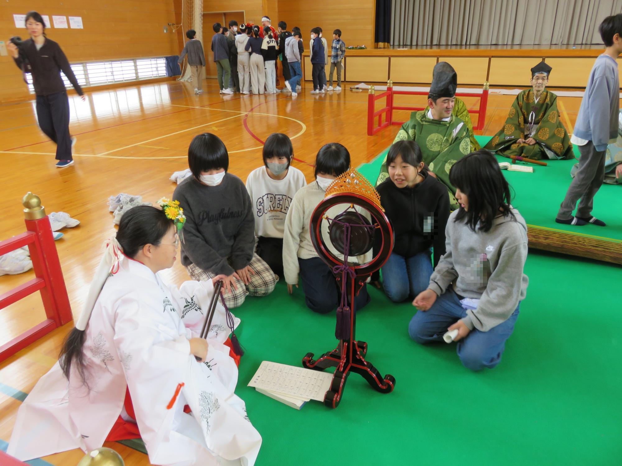 5・6年生を対象に雅楽教室を開催しました。4回目となる今年も、祭祀楽研修会12名の方々にお越しいただいて、演奏や舞を披露していただきました。演目は、「平調 音取」、「平調 越天楽」、「豊栄の舞」、「舞楽 蘭陵王」です。今年は、空気神社のお祭りで巫女の舞を披露している和合地区の児童を代表して3名が「豊栄の舞」の演奏に合わせて、舞を見せてくれました。