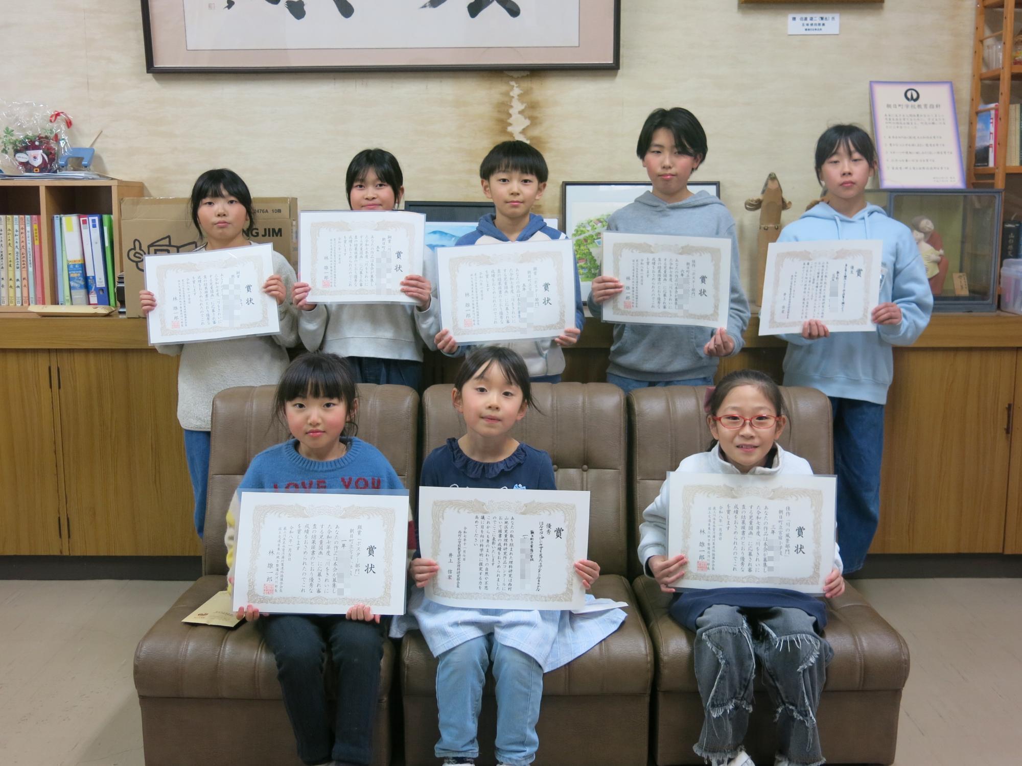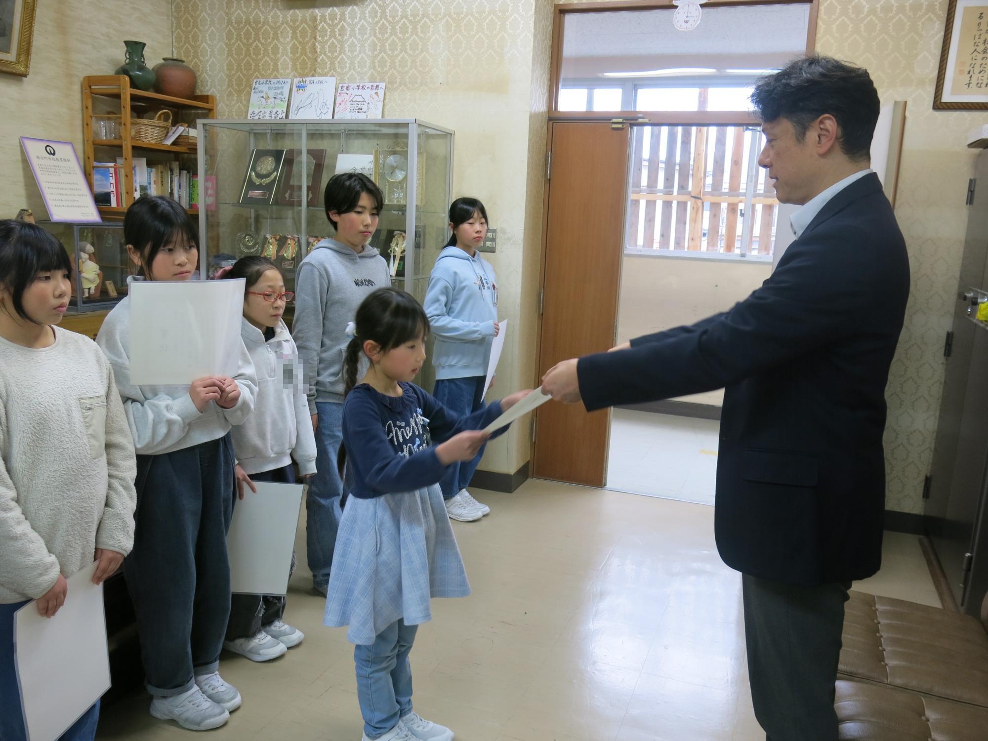 3月は全校が集まっての朝会などがないので、校長室で表彰を行いました。表彰したのは「川をきれいにする児童図画」と「小学校児童理科研究作品」で入選した8名です。おめでとうございます。