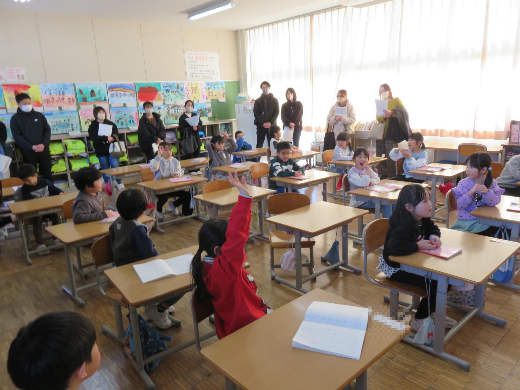 4月に入学予定の園児と保護者のみなさんに来校いただき、2回目の就学時オリエンテーションを行いました。保護者の皆様に学校生活についてのお話などをさせていただいている間、園児のみなさんは教室で絵を描いたり、体育館で5年生と鬼ごっこをしたりしながら楽しい時間を過ごしました。