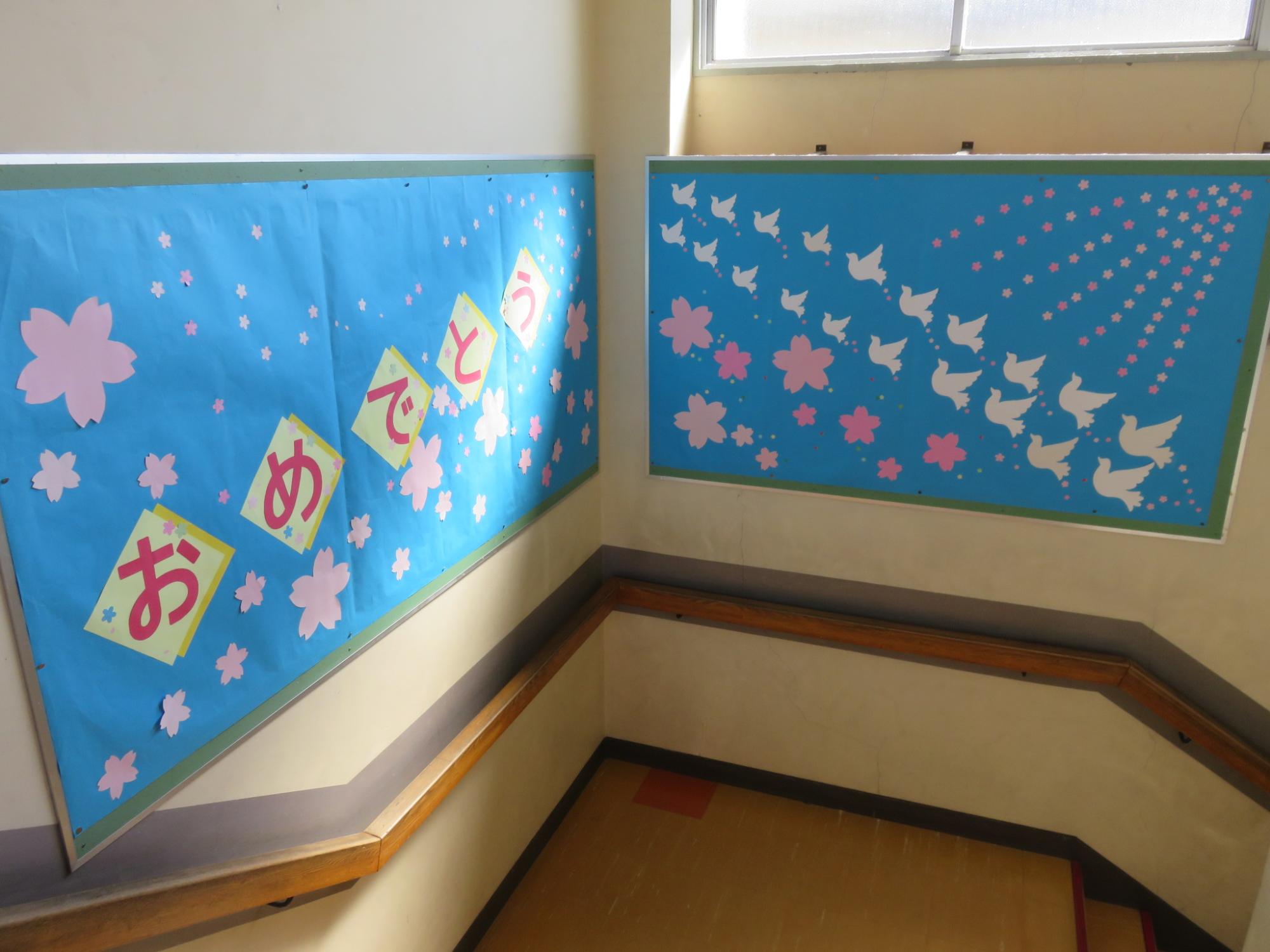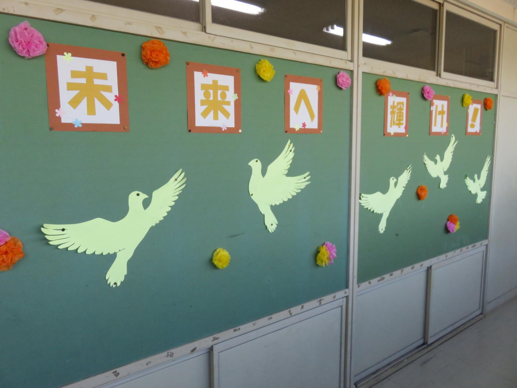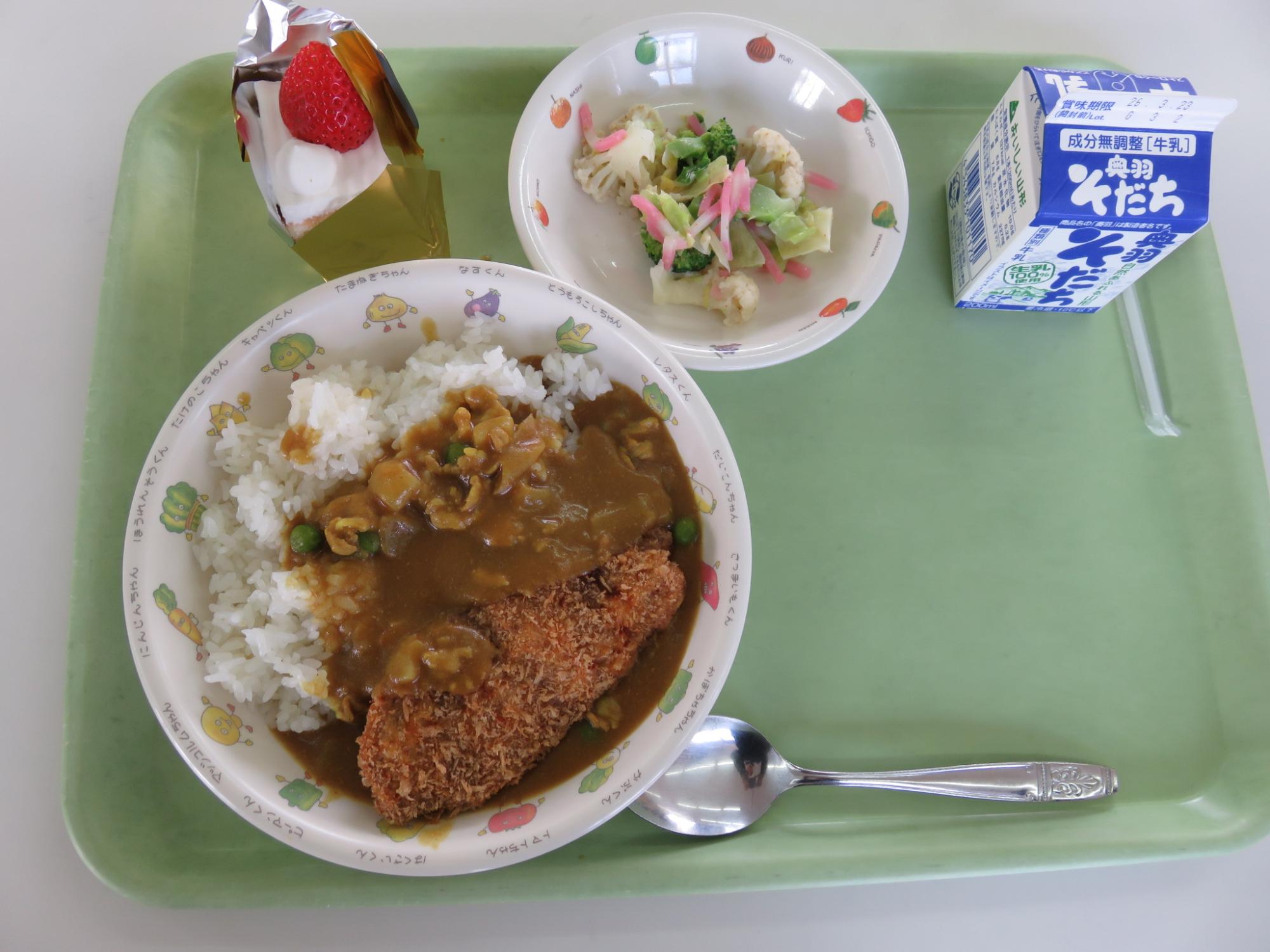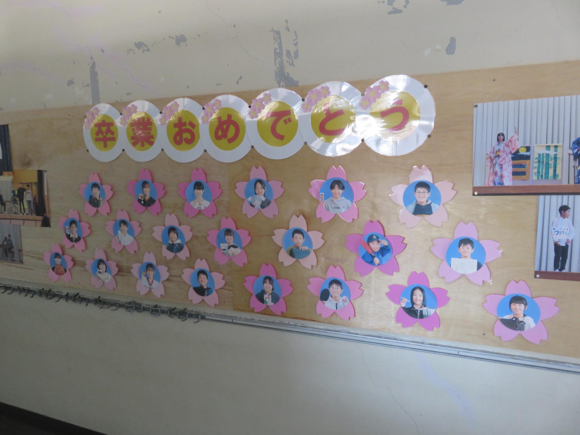 今年度もいよいよ最終週となり、卒業式は明後日……。この日は今年度の給食最終日。6年生にとっては小学校生活最後の給食となりました。カツカレーとサラダにショートケーキまでついた豪華なメニューでした。校内をまわると卒業を祝う掲示が飾られています。卒業する6年生にありがとうの思いを伝えるために、心をこめて準備しています。