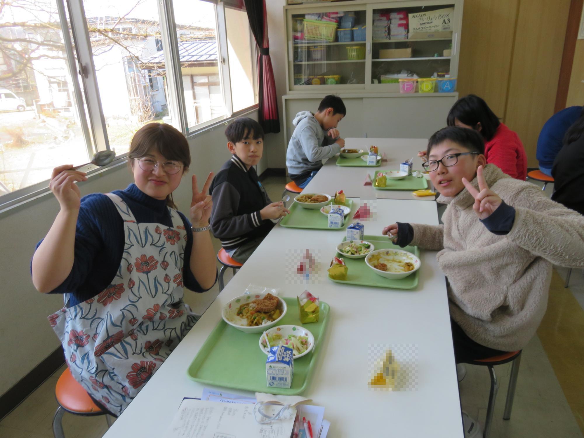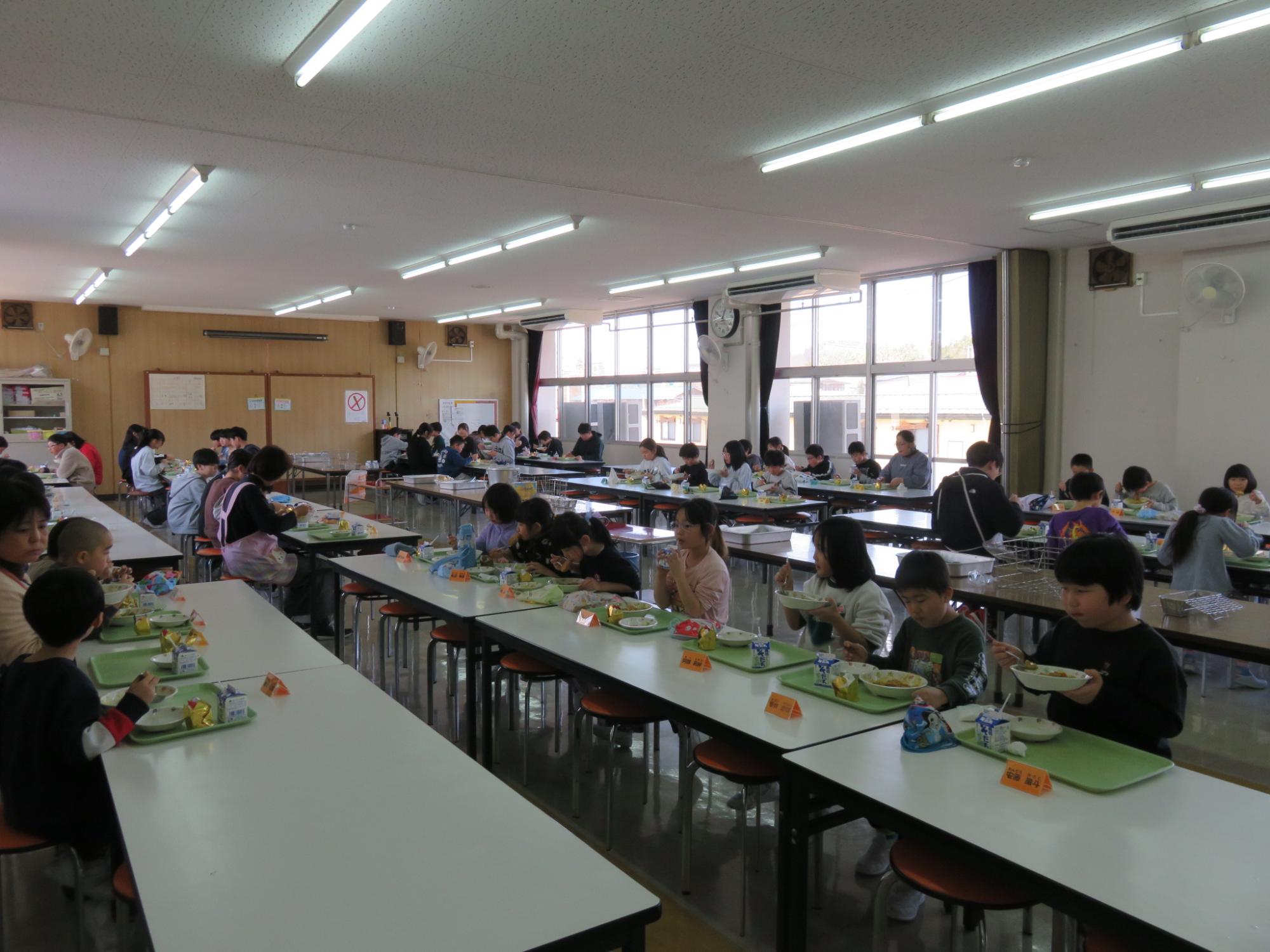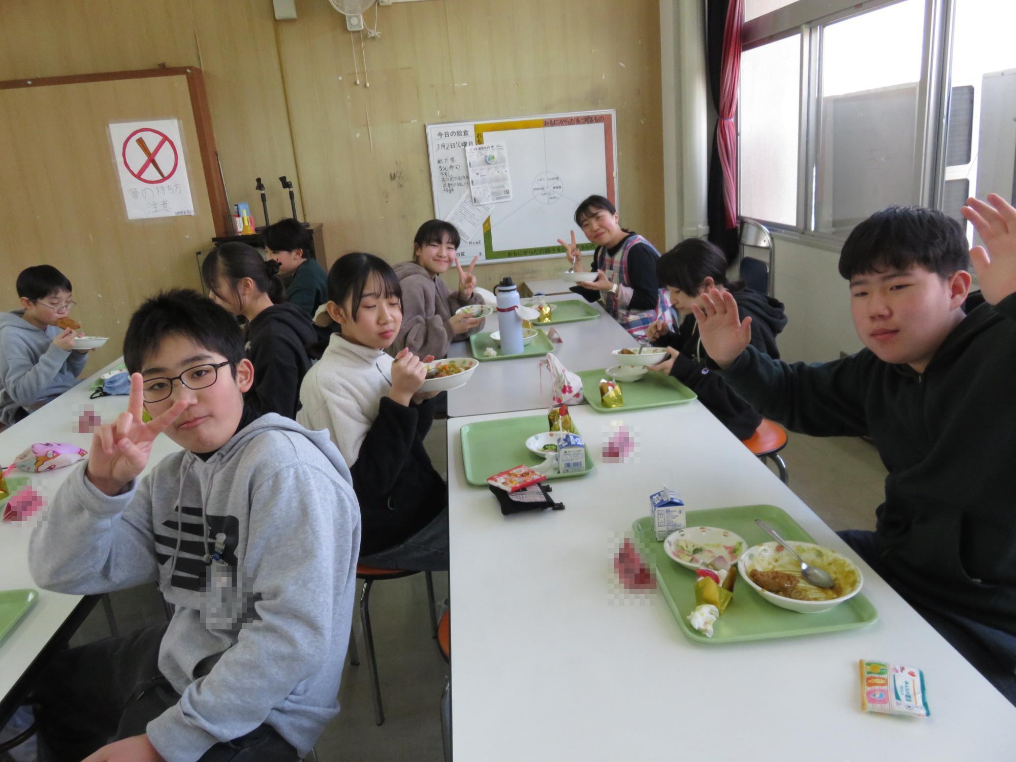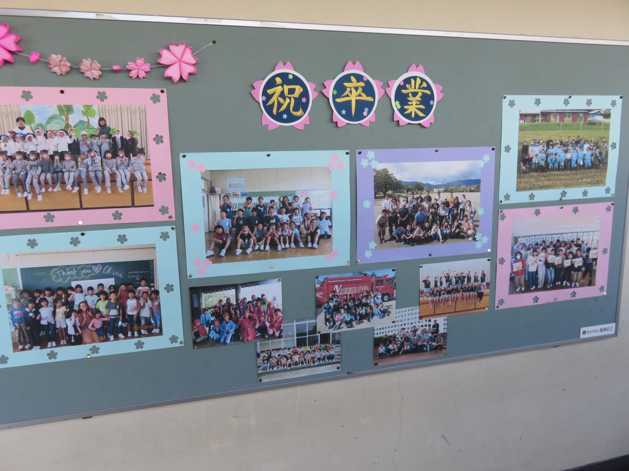 今年度もいよいよ最終週となり、卒業式は明後日……。この日は今年度の給食最終日。6年生にとっては小学校生活最後の給食となりました。カツカレーとサラダにショートケーキまでついた豪華なメニューでした。校内をまわると卒業を祝う掲示が飾られています。卒業する6年生にありがとうの思いを伝えるために、心をこめて準備しています。
