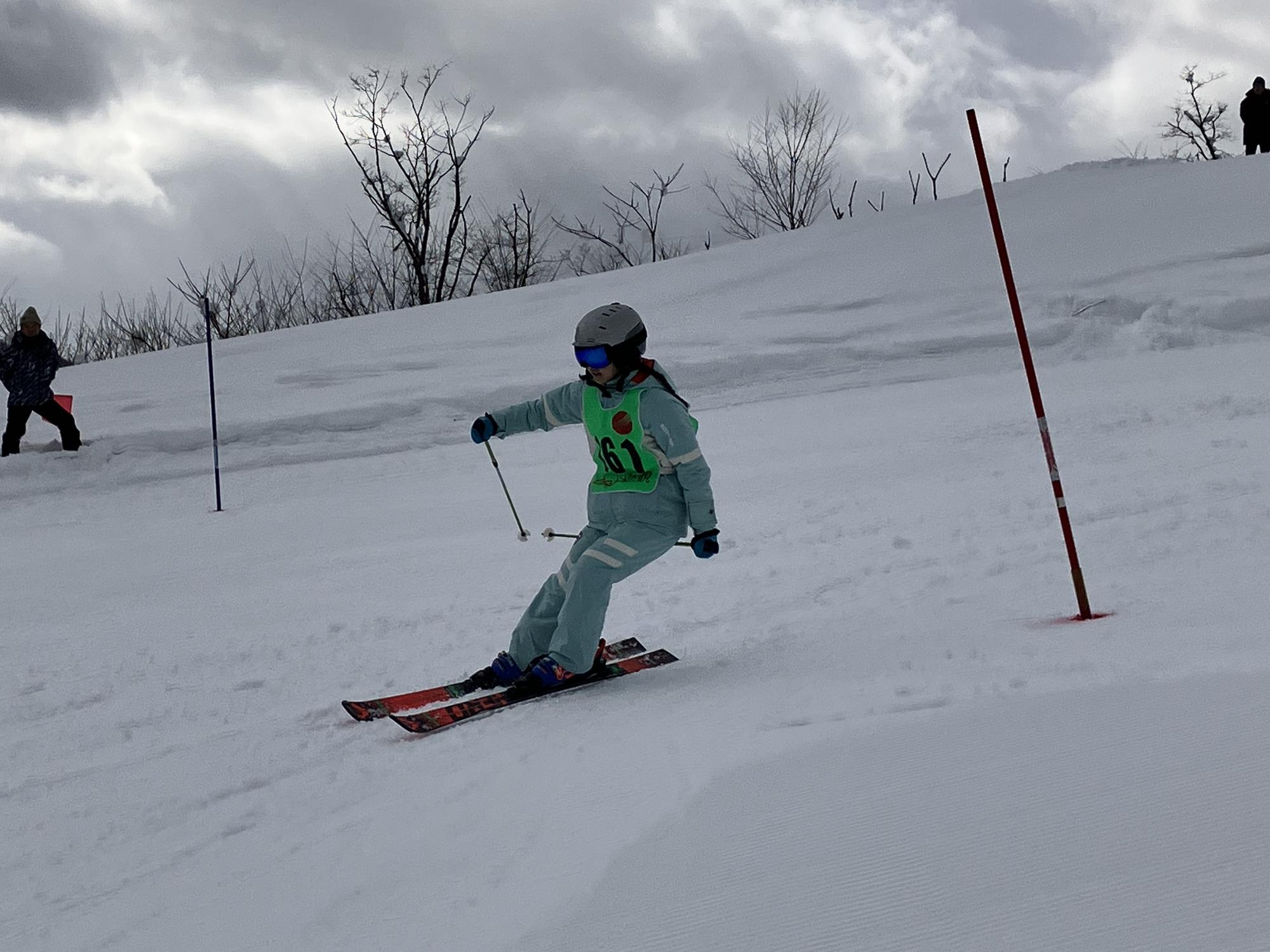 寒波到来の中、天候によっては時間の短縮も考えなくては…と心配していたのですが、開講式を終えて3年生以上が滑り出すと雪もやみ、青空が広がる時間帯もありました。雪質もよく、全体的には、むしろいいコンディションでのスキー教室となりました。他の学校や団体の利用がなかったので、ゲレンデを広々と使って、楽しく滑ることができました。5,6年生はスキー記録会に向けて、ポールを立てたコースでの練習も行いました。