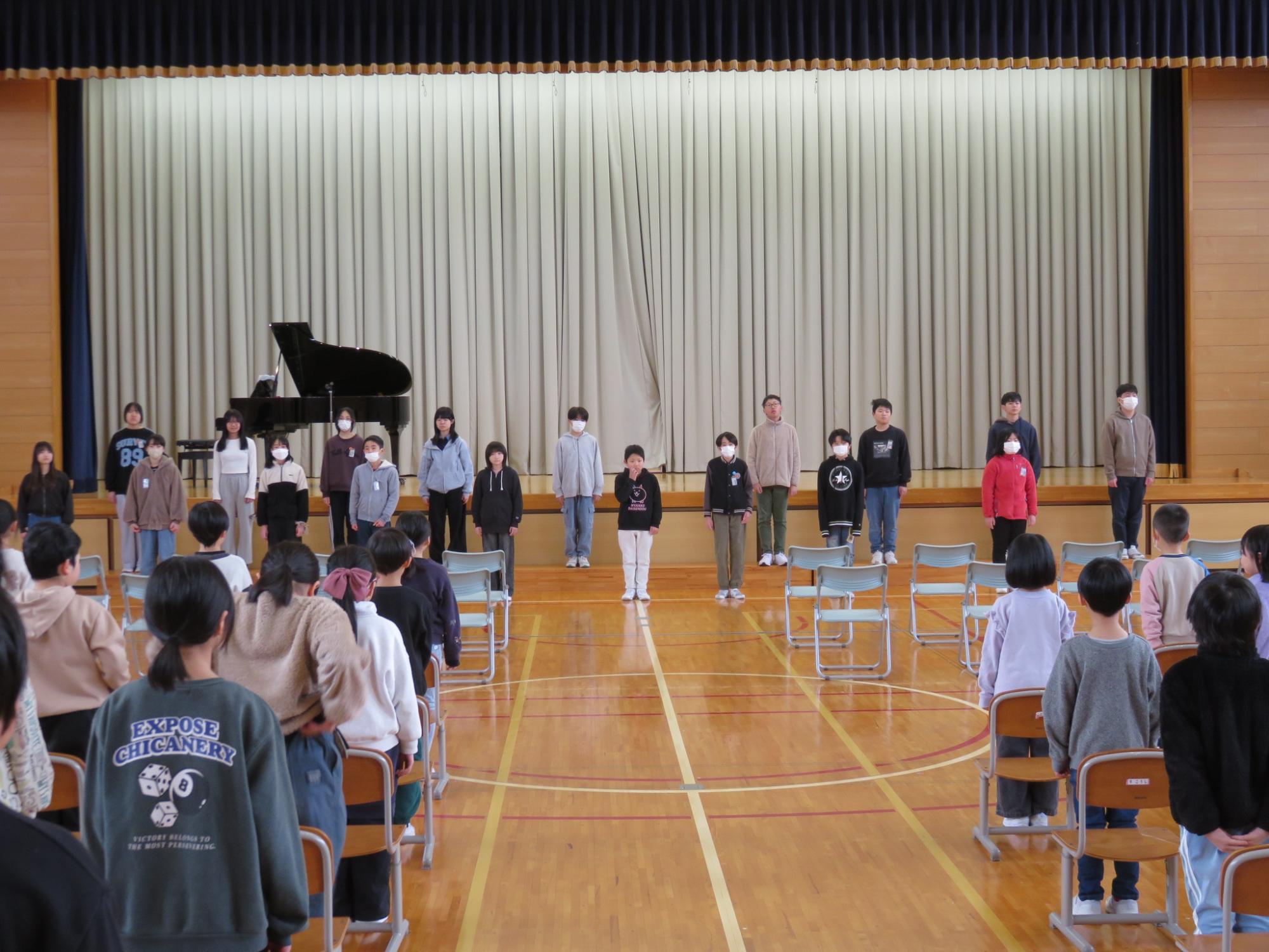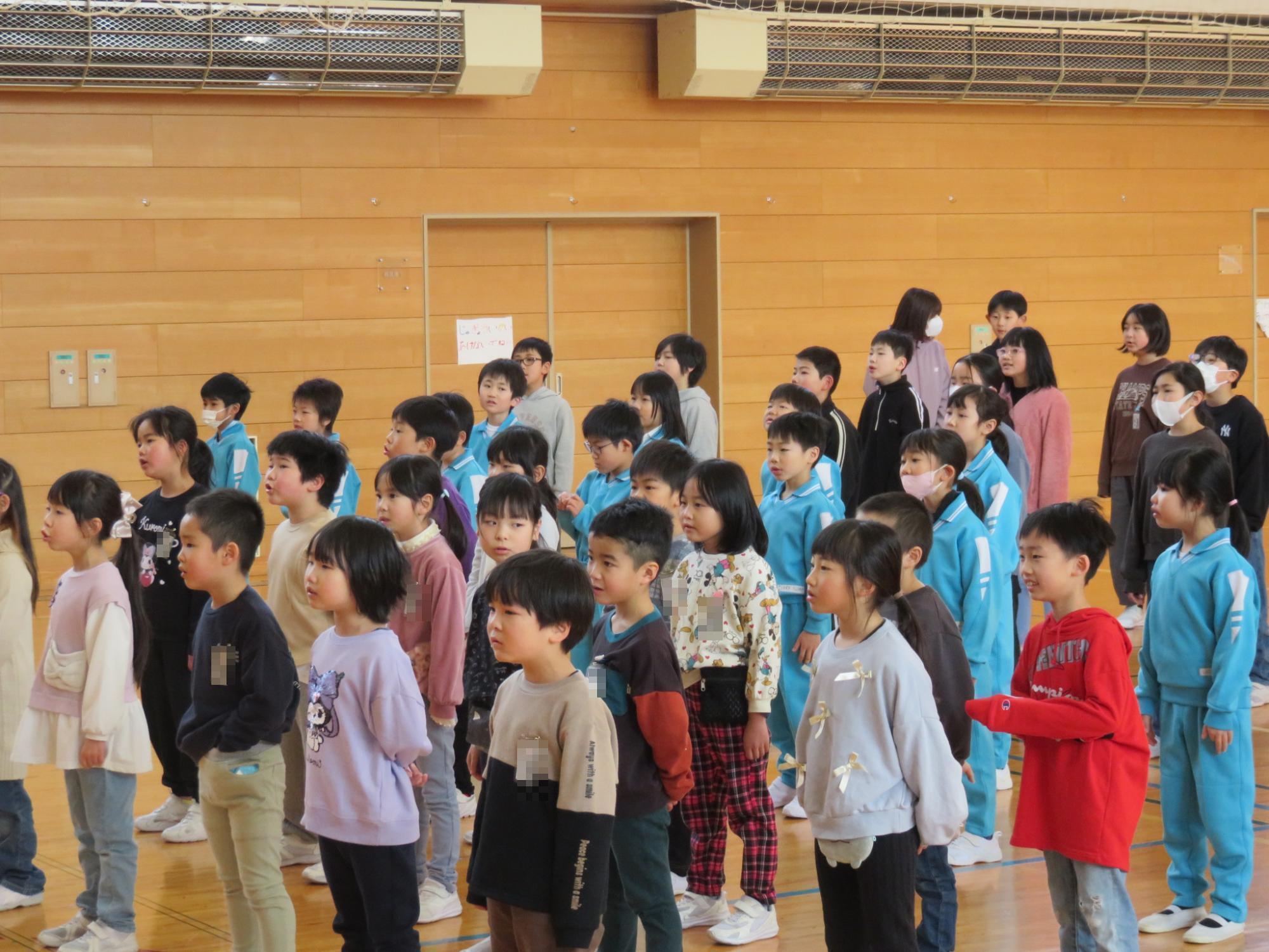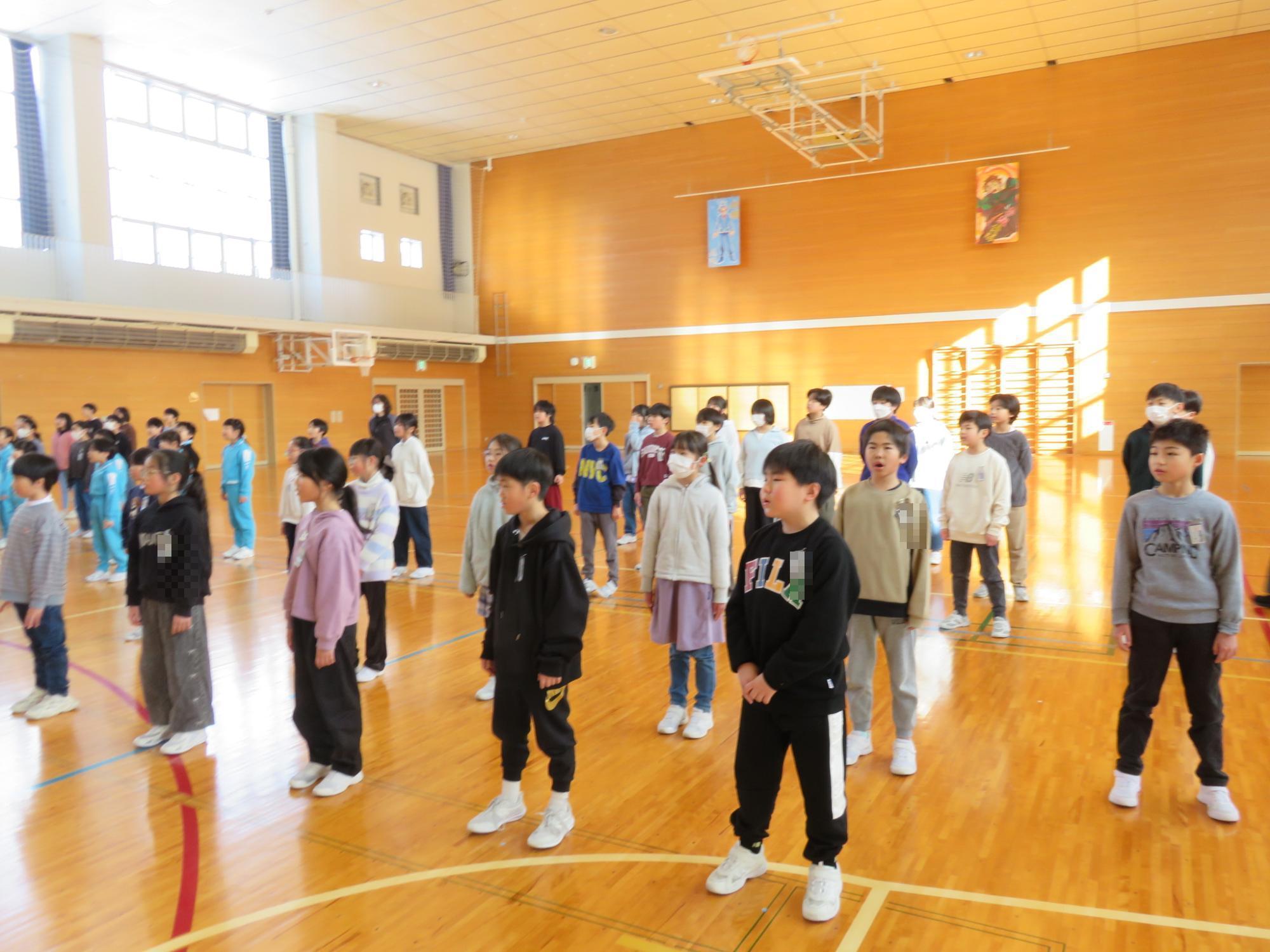 卒業式まで約1か月となりました。少しずつ卒業式に向けて練習や準備が始まっていきます。この日の音楽朝会から、6年生と1~5年生に分かれて、卒業式で歌う曲の練習がスタートしました。1~5年生は体育館、6年生は音楽室でそれぞれ練習しました。卒業式当日、きっと思いのこもった歌を聴かせてくれることでしょう。