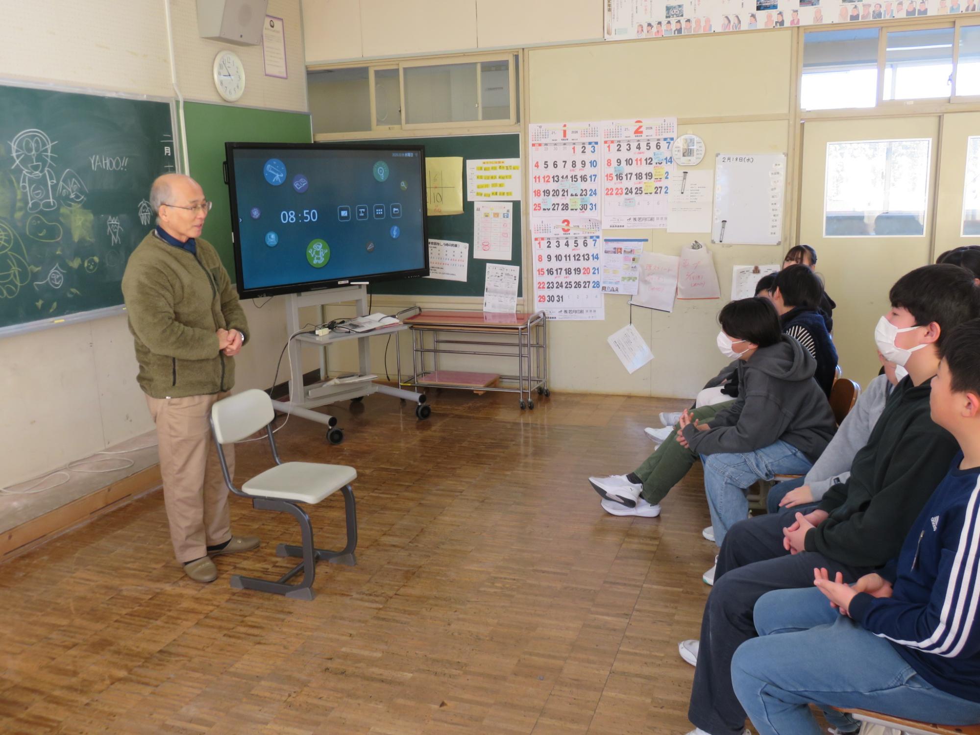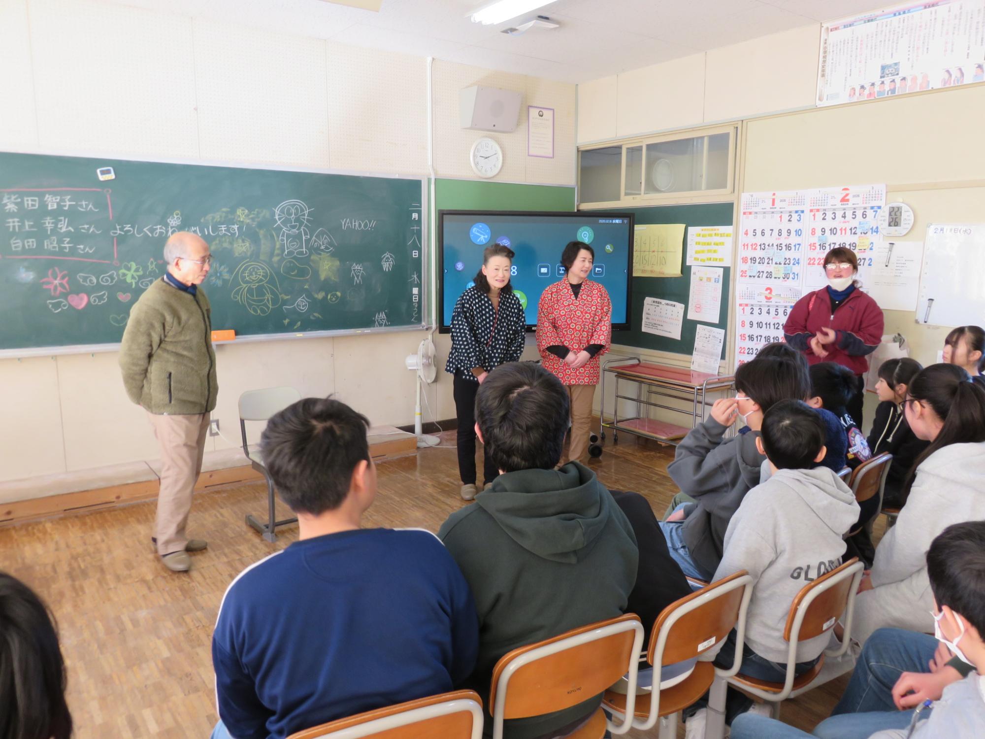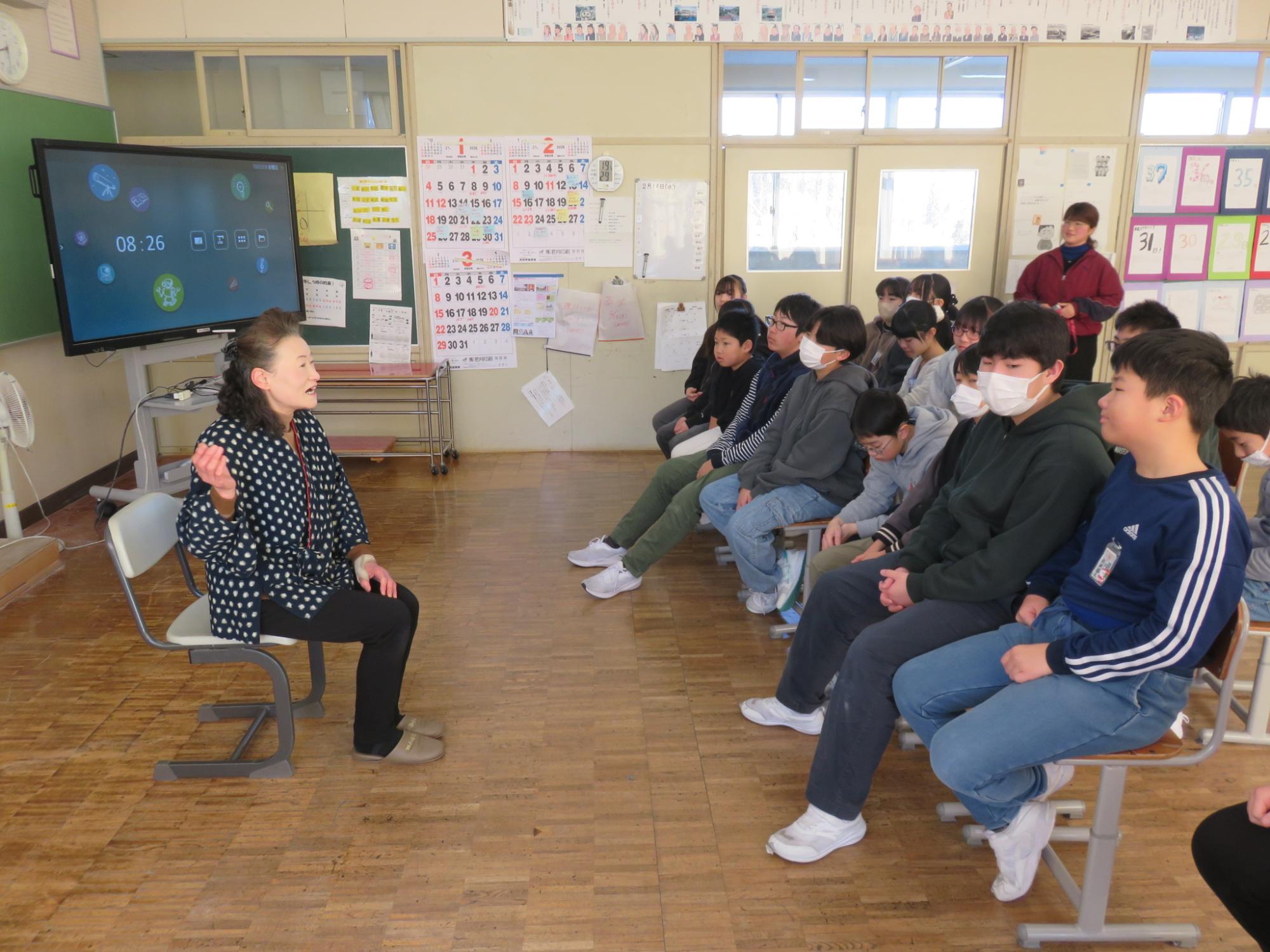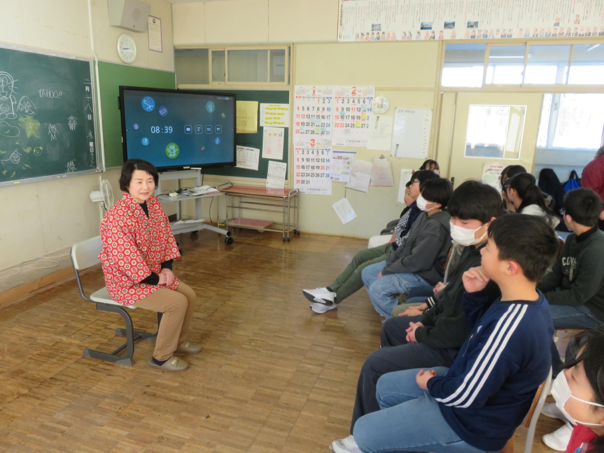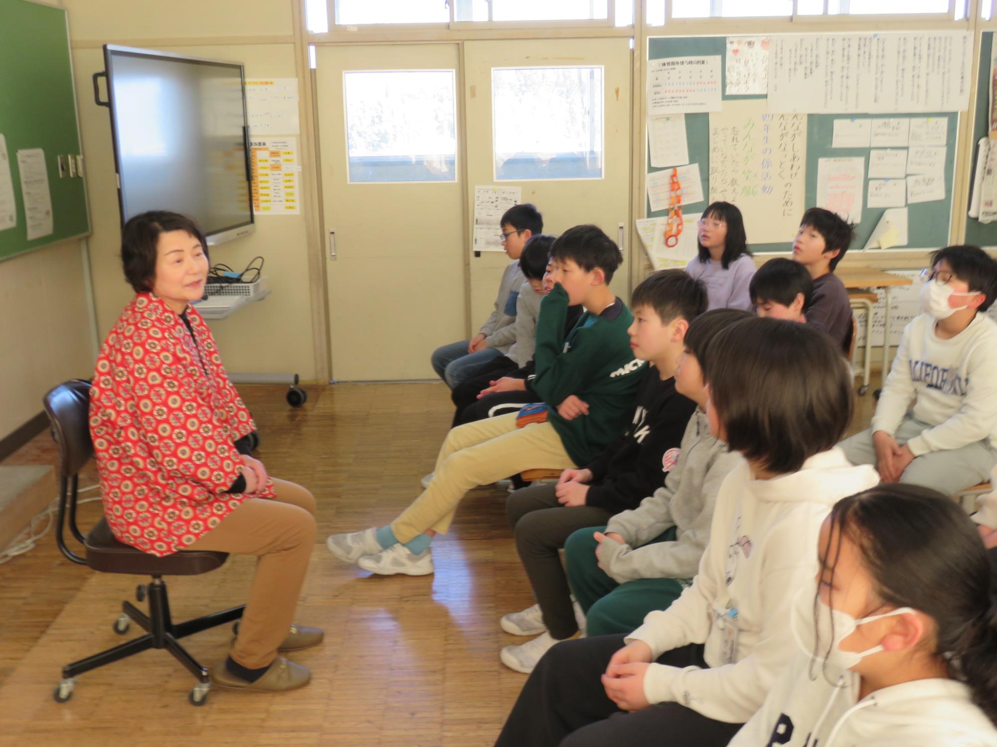 今年度もたくさんのお話を聞かせてくださった語りの会。18日が最終回となりました。4年生は、「子育て地蔵」、5年生は、「こぶとり爺」、そして今回が最後の語りの会となる6年生には、3名から「黄金沼、「子育て地蔵」、「山の上の火」の3つのお話を語っていただきました。身近なことがお話に出てくる『朝日町の昔ばなす』からエチオピアの昔話まで、お話の世界に引き込まれている子どもたちでした。