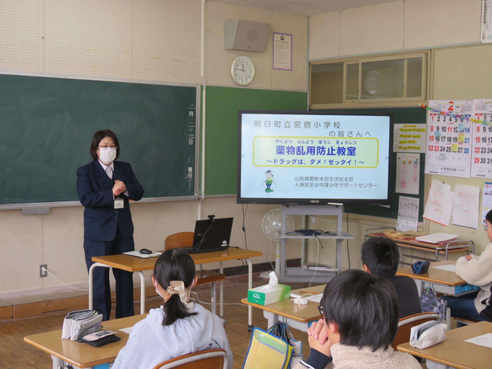 山形県警察本部の方々を講師にお招きして、6年生を対象に薬物乱用防止教室を行いました。法律で禁止されている薬物は、一度でも使用したら「乱用」になることや、薬物は心身に重大な悪影響しか及ぼさないこと、薬物によってこわれた脳は、元には戻らないこと、そして、もし誰かに誘われたとしてもその場から逃げて、自分の身を守ることなどを教えていただきました。
