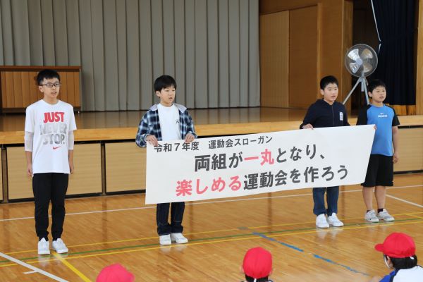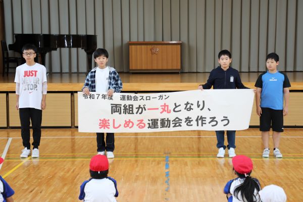 今年のスローガンは、「両組が一丸となり、楽しめる運動会を作ろう」です。