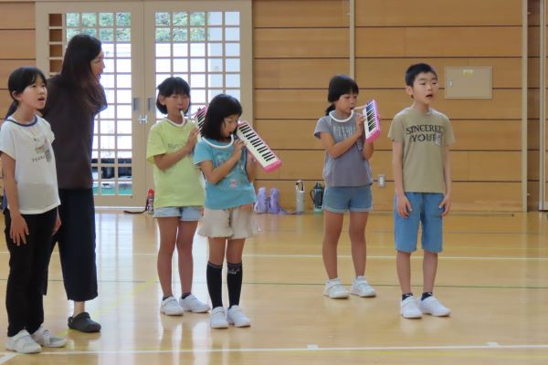 歌詞の中に「なかよくならんだ ことりのきぶんで」とあります。子どもたちはアーチをの形に並び、笑顔で歌いました。さらに、3・4年生から鍵盤ハーモニカの伴奏をしてもらい、音色の重なりを楽しみました。