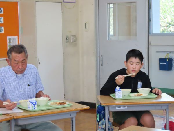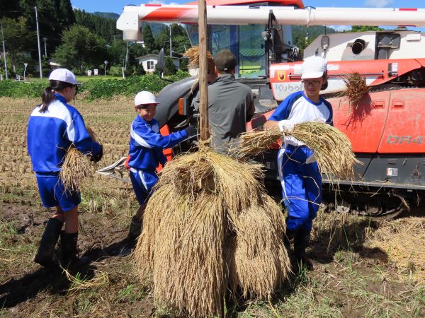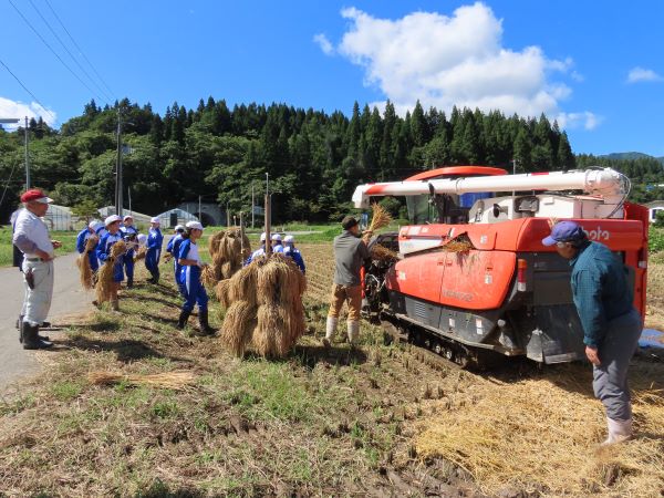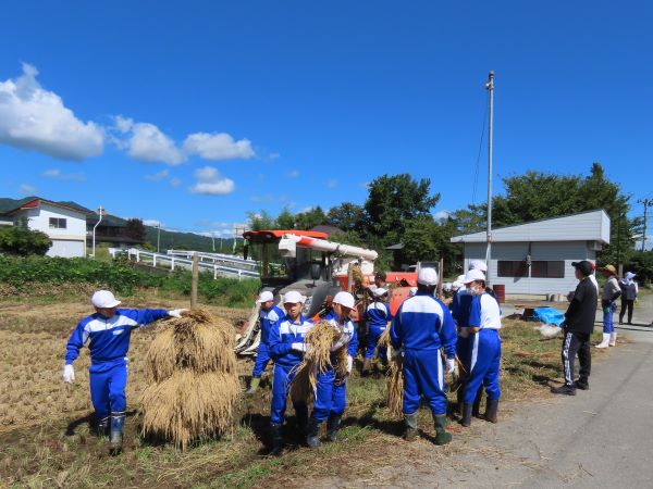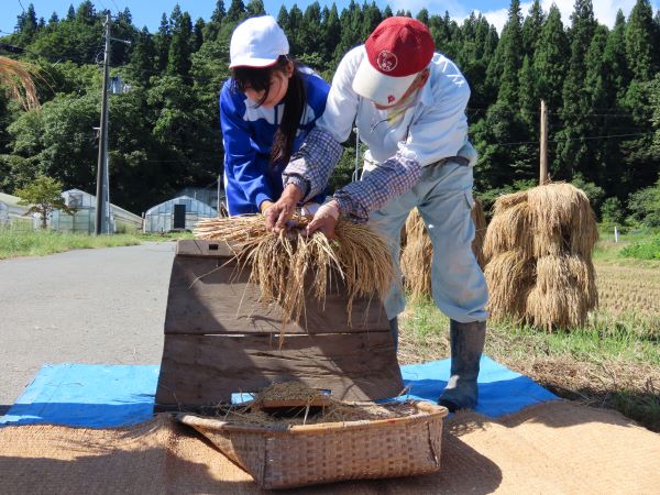 5・6年生のお米の学習もいよいよ終盤です。松程の学習田で、稲刈りをしました。種をまき、田植えをしたお米の収穫です。初めて鎌をもつ子も多く、慣れない手つきで始めたものの、松程集落営農組合のみなさんが教えてくださって、無事に刈取って束ねることができました。束ねる作業では苦戦していましたが、少しずつコツをつかんだようです。束ねた稲は杭掛けをして、天日乾燥します。次は脱穀。手作業の大変さを実感し、昔の農家さんの苦労に思いをはせることができたようです。