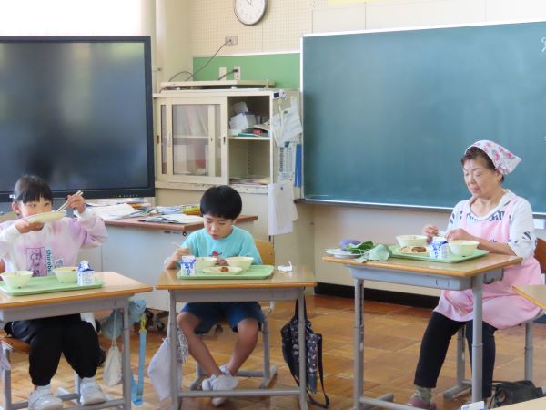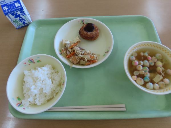 「あけび」の全国生産量の約9割が山形県産であり、朝日町はその中心的な産地です。この「あけび」の料理が給食で出てきました。献立は「ごはん、牛乳、山形県産里芋コロッケ、あけびのみそ炒め、すまし汁」です。あけびのみそ炒めは、細かく切って炒めてあり、苦みが強くありません。あけびを初めて食べる子どももいましたが、みんなおいしくいただきました。