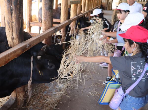 生後10か月の子牛の体重は300kg程だそうですが、2年間で、1頭の体重が600kg程になるそうです。子どもたちは、牛はどんな餌を食べるのか、1回でどれくらい餌を食べるのか、病気になったりしないのか等、たくさん質問をしていました。