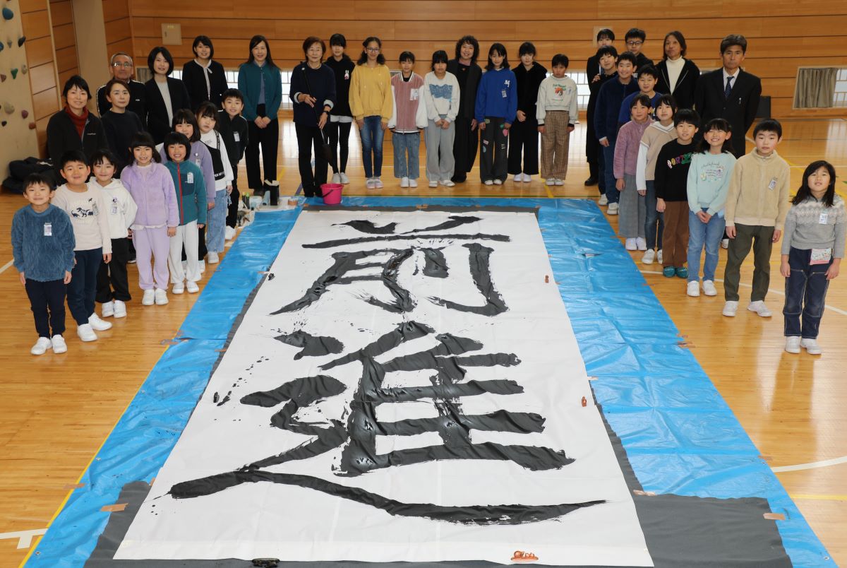 まず、水口の長岡先生より、今年の児童会テーマ『前進』を特大用紙に大書していただきました。子どもたちは、大迫力の文字、躍動感ある『前進』に見入っていました。