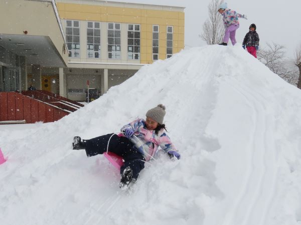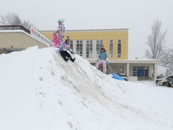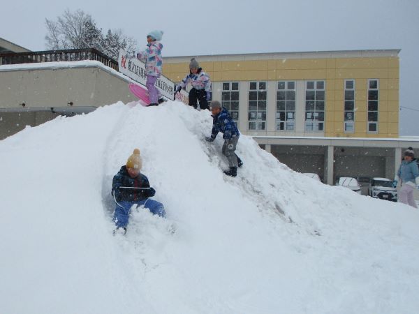 1・2年生が、生活科「ふゆだいすき」で、雪遊びをしています。昇降口前の駐車場を除雪した雪で、用務員さんに雪山を作ってもらいました。今シーズン最初で、まだふかふかの雪山です。そり乗りには、柔らかすぎた雪でしたが、子どもたちは何度も雪山に登り、そり乗りを楽しんでいました。