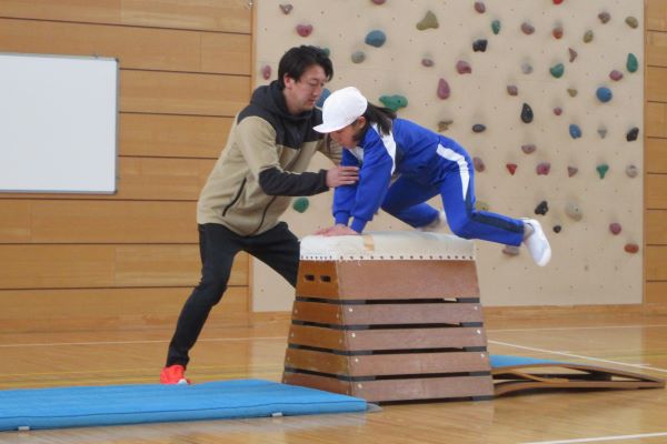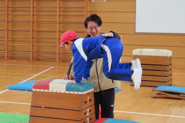 マット遊びでは、体を揺らしたり、前転がり、後ろ転がりに取り組みました。そして、跳び箱遊びでは、ロイター式踏切板を使って両足で踏み切る感覚をつかみ、腕支持での跳び越しに挑戦しました。技のコツをわかりやすく教えていただき、マット遊び・マット運動がますます好きになりました。
