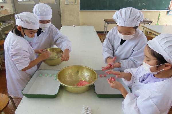 団子の粉を丸め、ゆでて味見をすると、砂糖も入っていないのに「甘い!」「おいしい!」と大喜びの子どもたちです。。