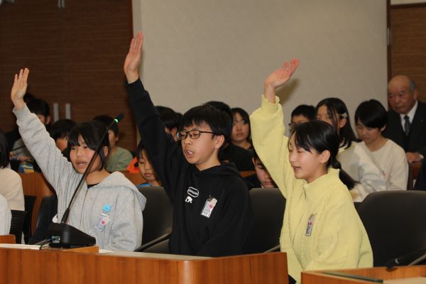 町議会の会議場で、町の子ども議会が行われました。西五百川小学校からは、5・6年生が出席し、代表児童が一般質問と提案をしてきました。質問内容は、今年度の総合的な学習の時間で学んできたことに関わって、「あさひ未来学園で水道について考えていることはありますか。」と質問し、「学校でおいしい水が飲めるように、ウオーターサーバーを設置してください。」とお願いをしてきました。それから「町に空き家はどれくらいありますか。」と質問し、「空き家を利用して、買い物ができる店舗をつくることはどうですか。」と提案しました。