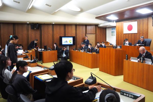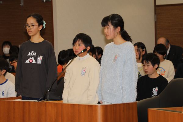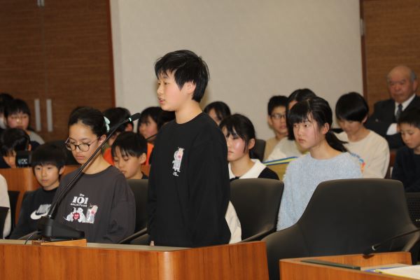 町議会の本会議場で、町長さんに質問・提案することで、たいへん緊張したことでしょう。けれども、学んだことを生かし堂々と発表すること、自分の考えをしっかり伝えることができたことは、日頃の学習の成果です。