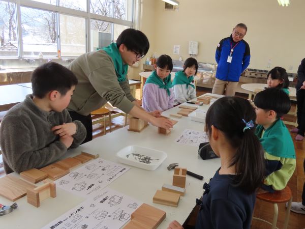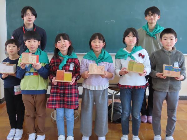 緑の少年団の活動で、ペン立てを製作しました。講師の先生は、地域おこし協力隊の今野さん、そして農林振興課の和南城さんと白田さんの3名にお越しいただきました。カットした西山杉(朝日町、大江町、西川町が産地となるブランドの杉材)の板に釘を打って組み立ててました。最初はなかなか釘が入っていかなかったのですが、だんだんと釘を打つスピードがあがっていきました。組み立てたペン立ての角をやすりで削ったあとは、お楽しみの色塗り。用意していただいたアクリル絵の具やスタンプを使って、思い思いのペン立てに仕上げていました。