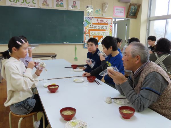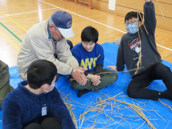 まず、田んぼの先生方に縄ないを教わりました。昔は稲わらが紐や靴などの生活道具だったそうです。子どもたちは初めての縄ないに苦戦しながらも、少しずつなっていきました。その後、家庭科室へ移動し、子どもたちが朝のうちに作ったおにぎりと味噌汁をみんなでいただき、田んぼの先生に感謝の手紙を渡しました。