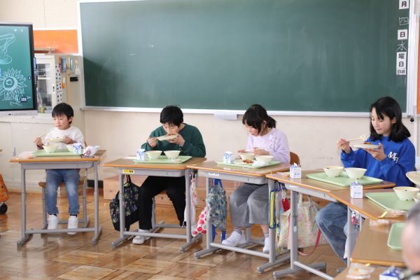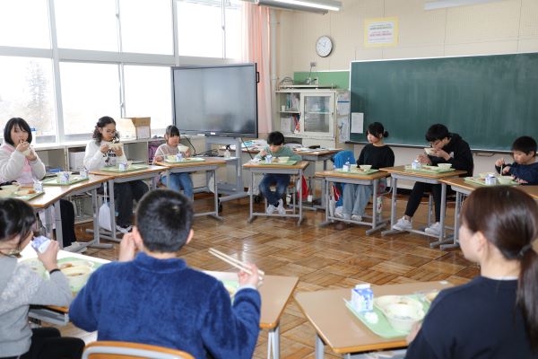 全校生が二つのグループに分かれ、6年生に一人ずつ入ってもらって、一緒に給食を食べました。「6年生ありがとう給食」の献立は、「わかめごはん、牛乳、鶏肉のから揚げ、ポテトサラダ、つゆだくおでん、お米のタルト」でした。