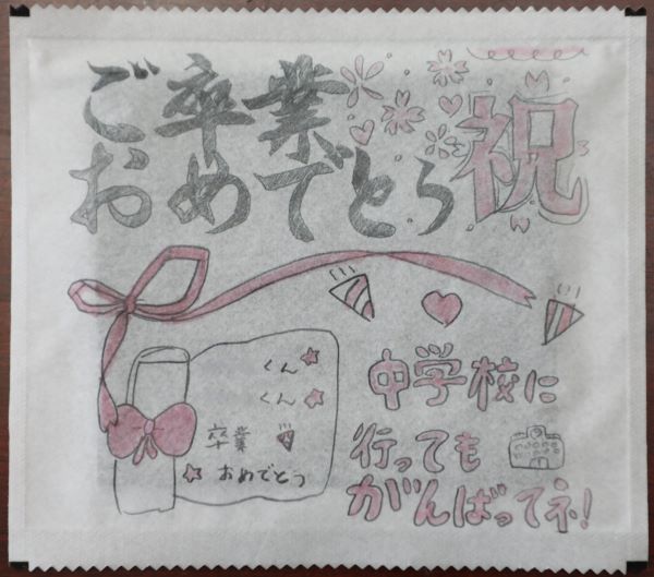今日の給食の献立は、「手巻き寿司(酢飯、海苔)、牛乳、お祝いすまし汁」です。手巻きずしの具となるのは、ウインナー、ツナマヨサラダ、納豆です。寿司を巻く乗りの袋「卒業おめでとう 中学校に行ってもがんばってネ!」は、本校5年生がデザインしてくれました。