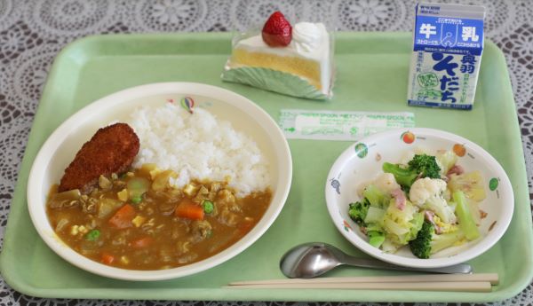 メニューは、「かつカレー、牛乳、花野菜さらだ、いちごのショートケーキ」です。卒業生の二人も大好きな献立です。小学校の思い出の一つに加えてくれることでしょう。