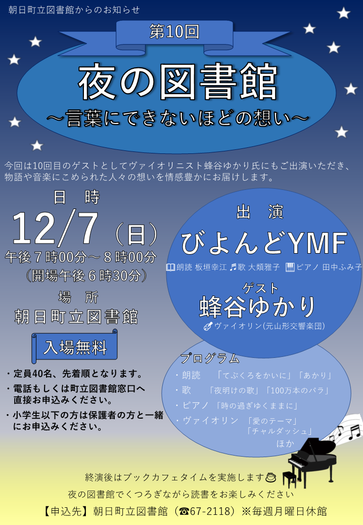 普段は入ることのできない「夜の図書館」で、いつも違った雰囲気の中で、音楽と朗読を組み合わせて本の楽しさをお届けするイベント。終了後は、館内で温かい飲み物を飲みながら過ごせる夜の特別な図書館をお楽しみください。
