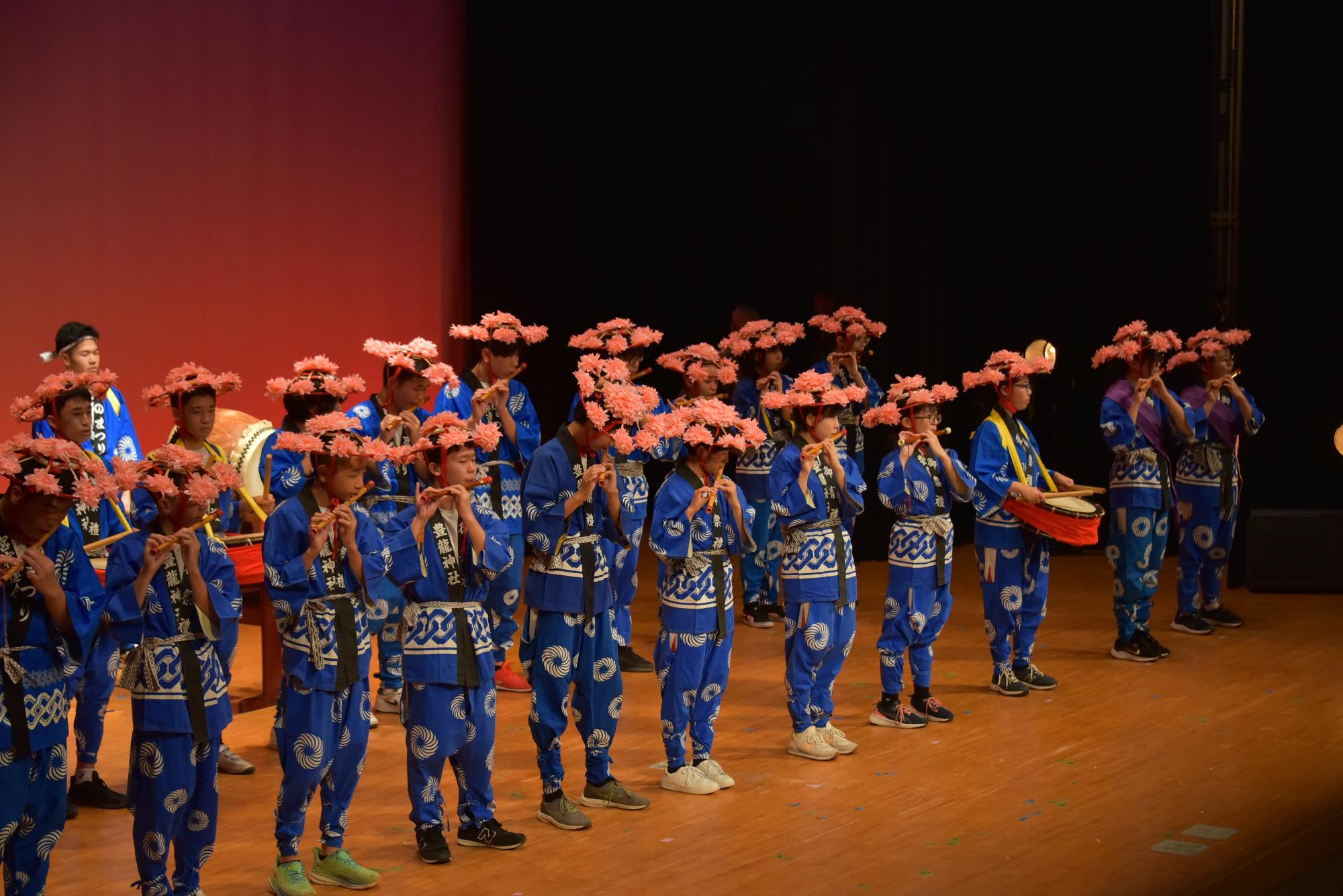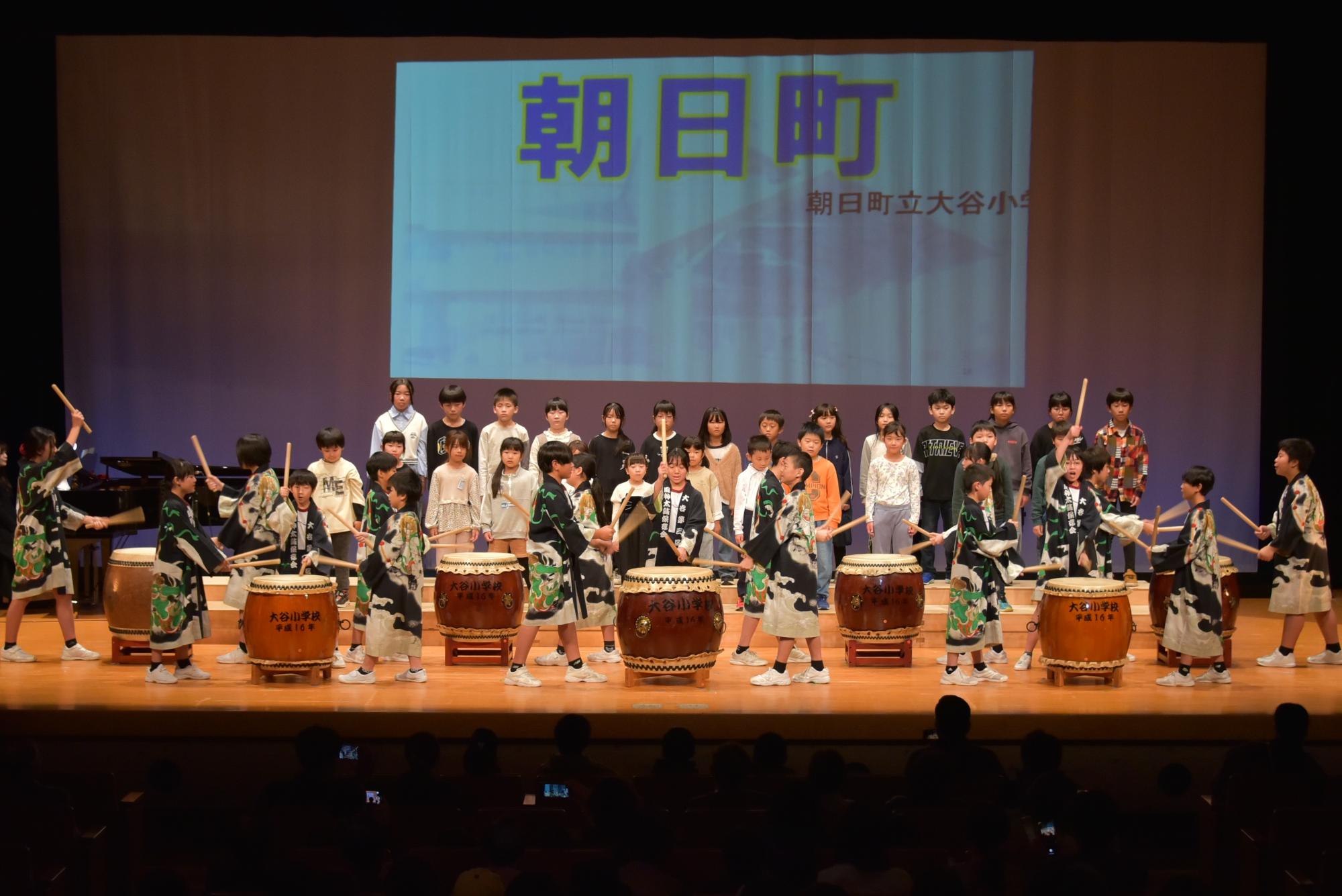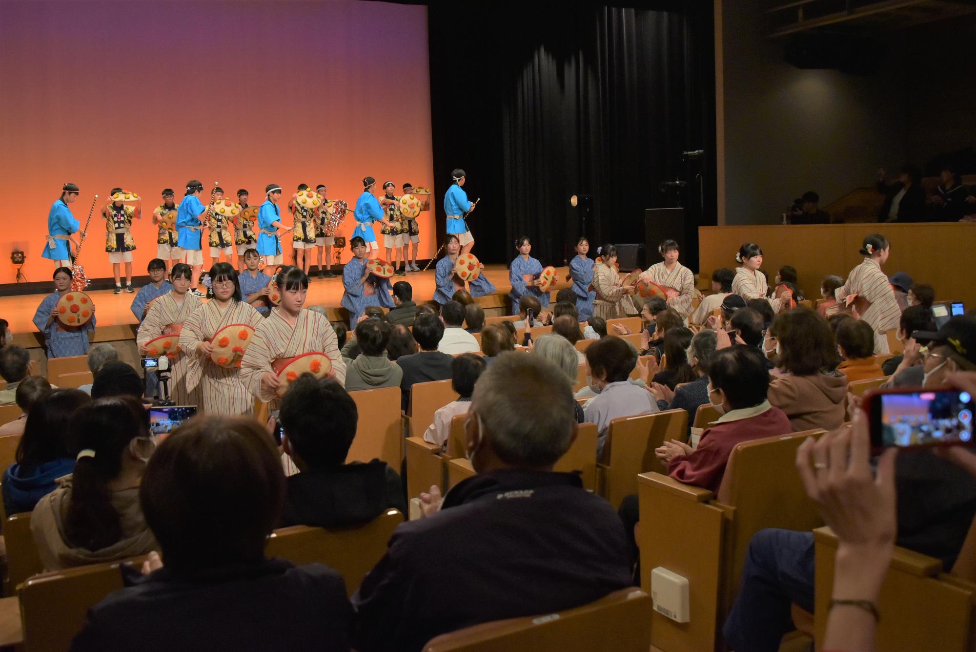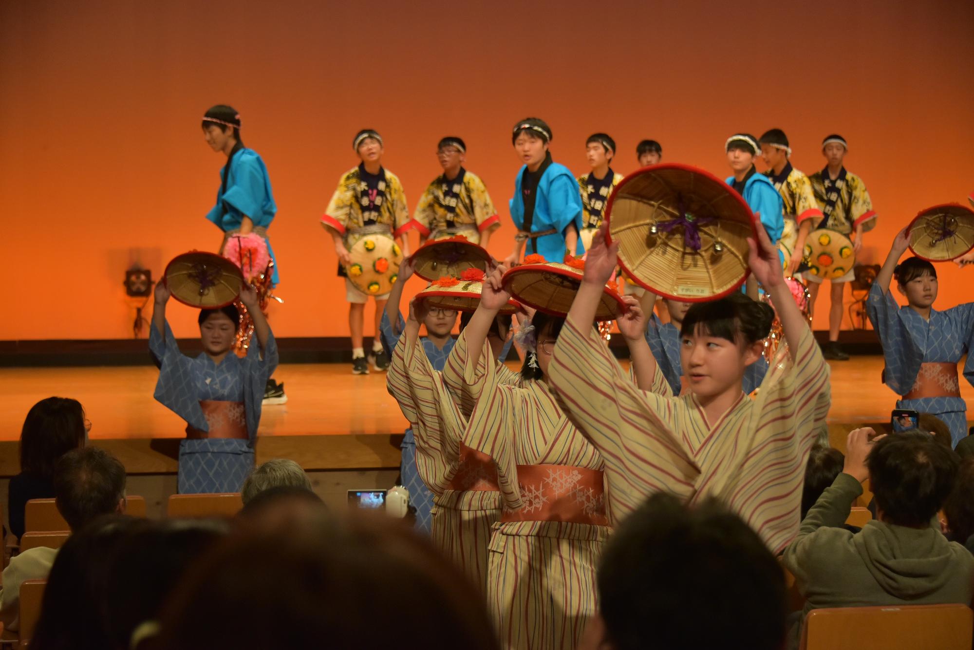 午後からの発表は朝日中生の太鼓の演奏でスタート。続いてお囃子や日本舞踊、吟道が発表され朝日中全校生徒による合唱で幕を閉じました。