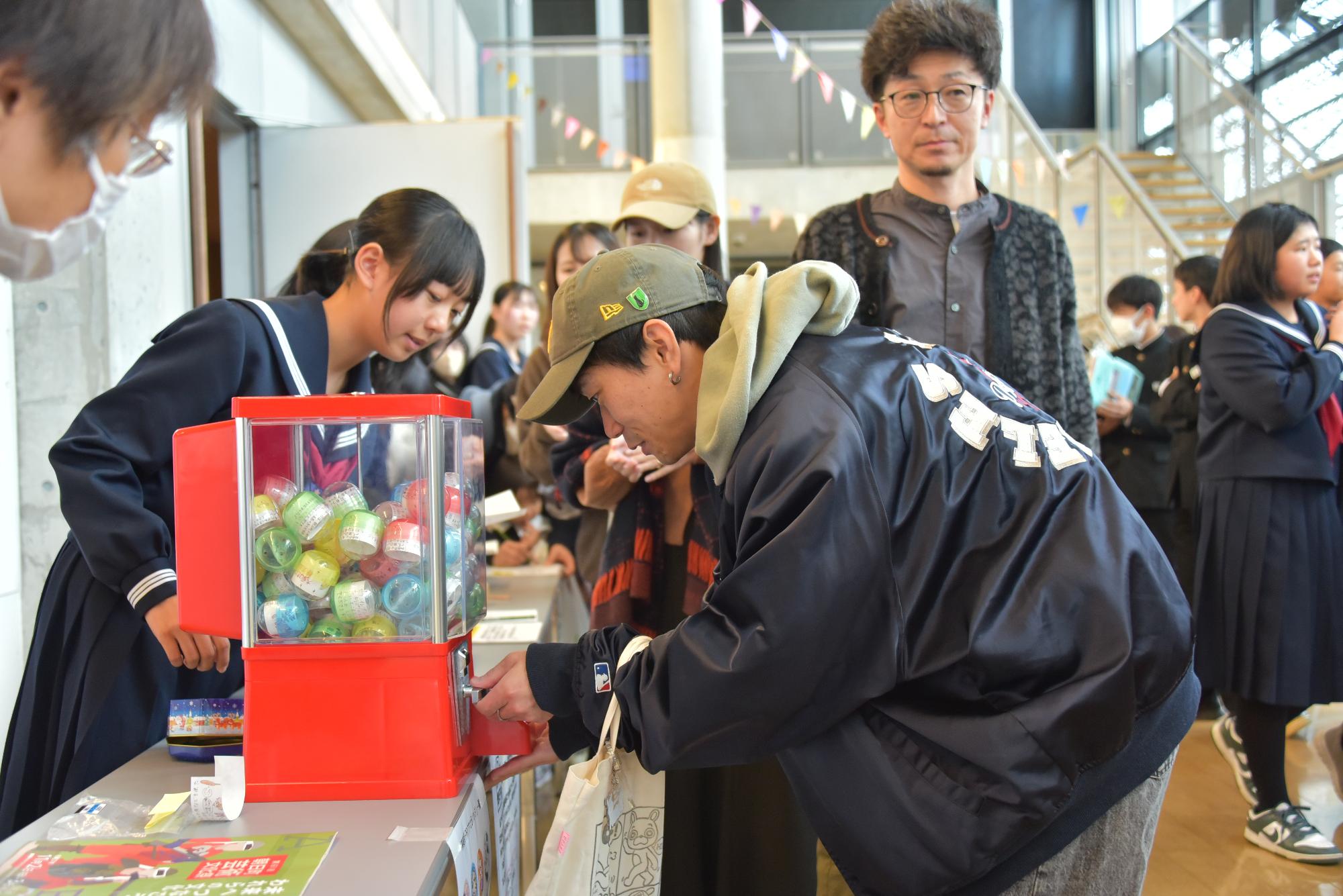 朝日中2年生が製作した、町内事業所の特徴が描かれた缶バッチは昨年に引き続き多くの来場者から好評を集めていました。
