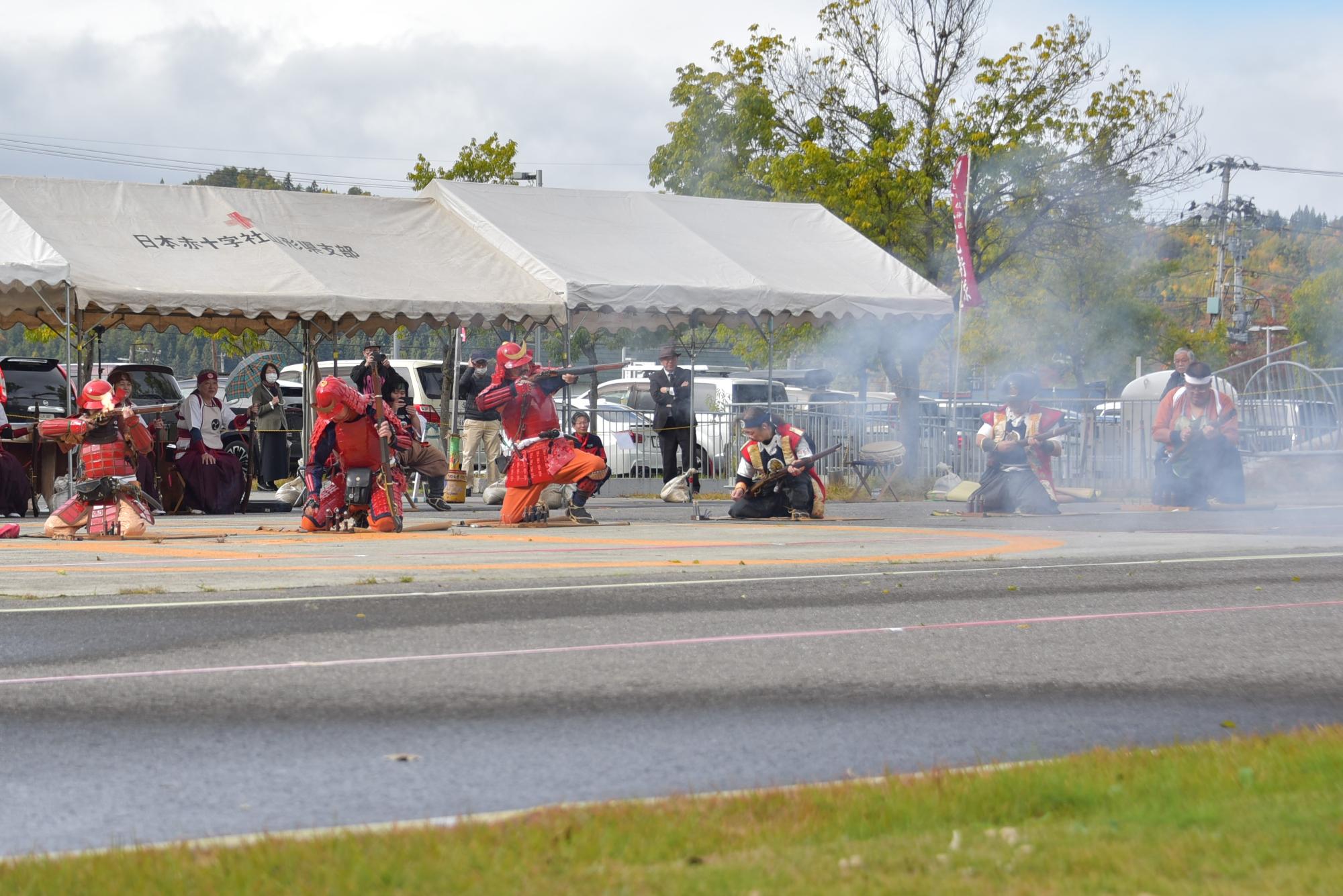 正午を過ぎると1時間の休憩時間が設けられ、創遊館裏の芝生広場では火縄銃の砲術が披露。迫力満点の光景は来場者を夢中にさせました。