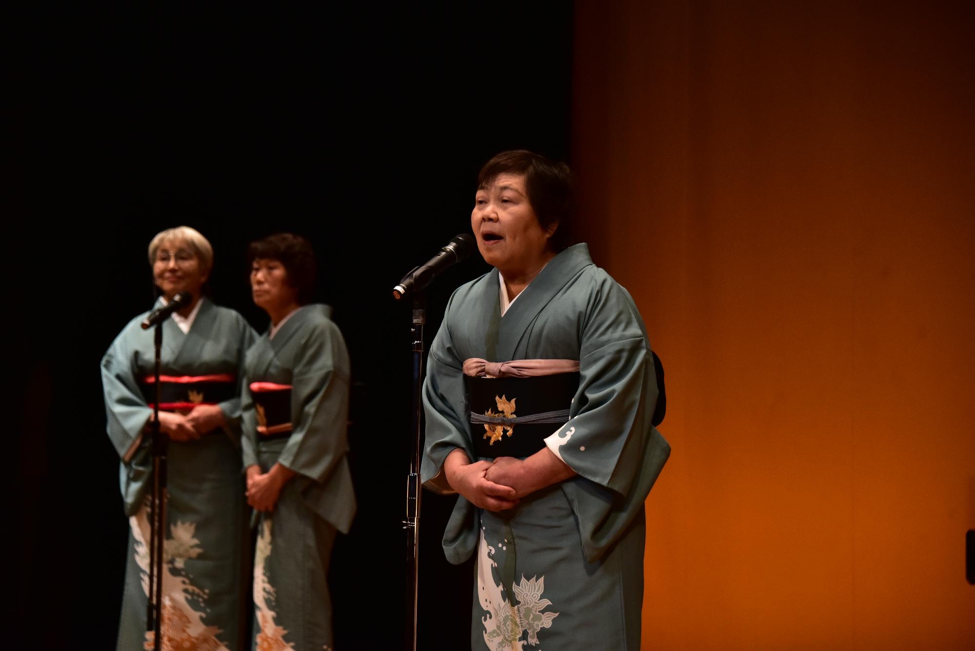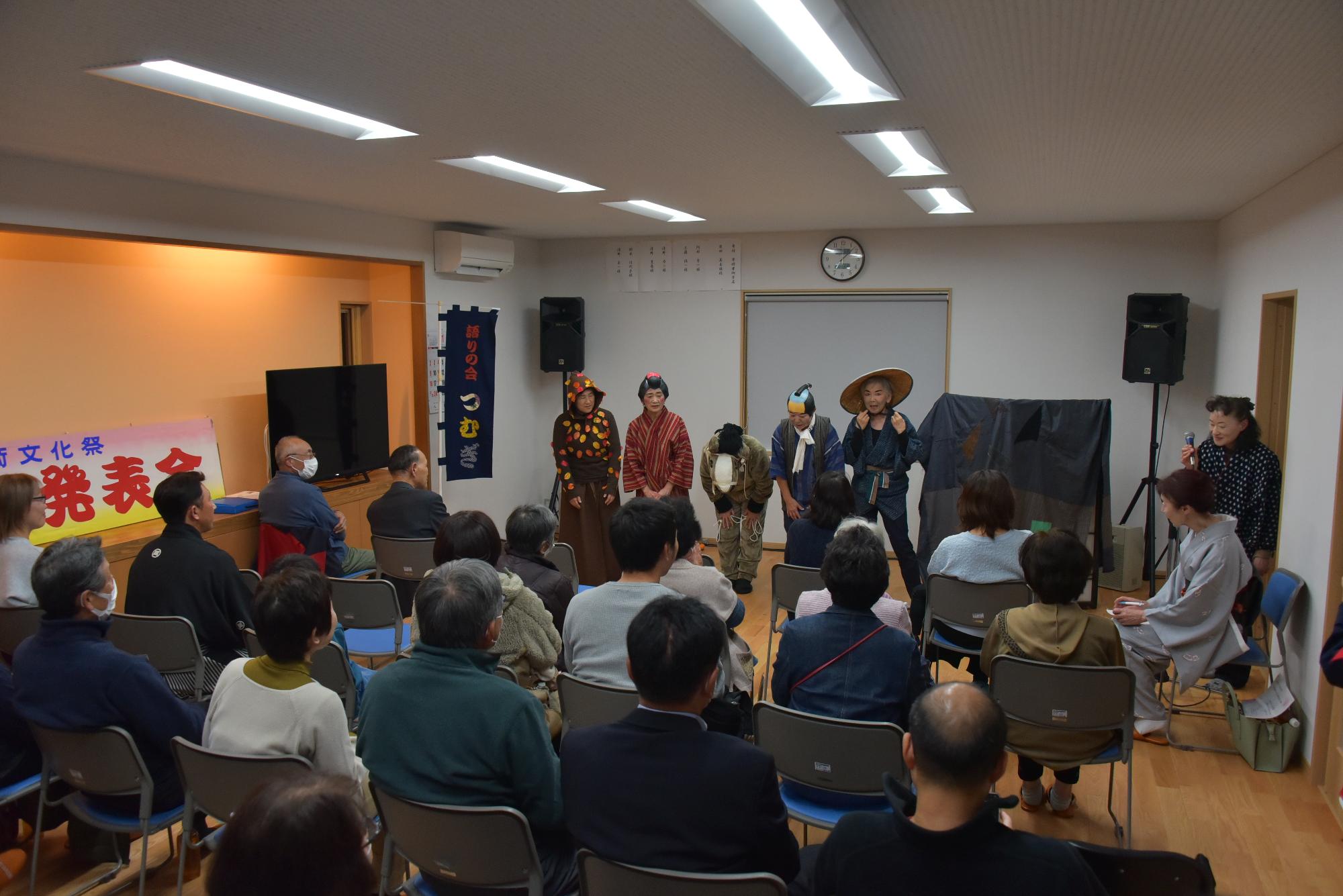 午後6時45分、移動芸能発表会が四ノ沢公民館で開催。多くの同区民が訪れ、民話劇や日本舞踊、吟道、民謡、歌を楽しんでいました。